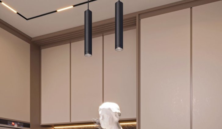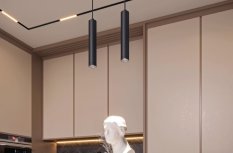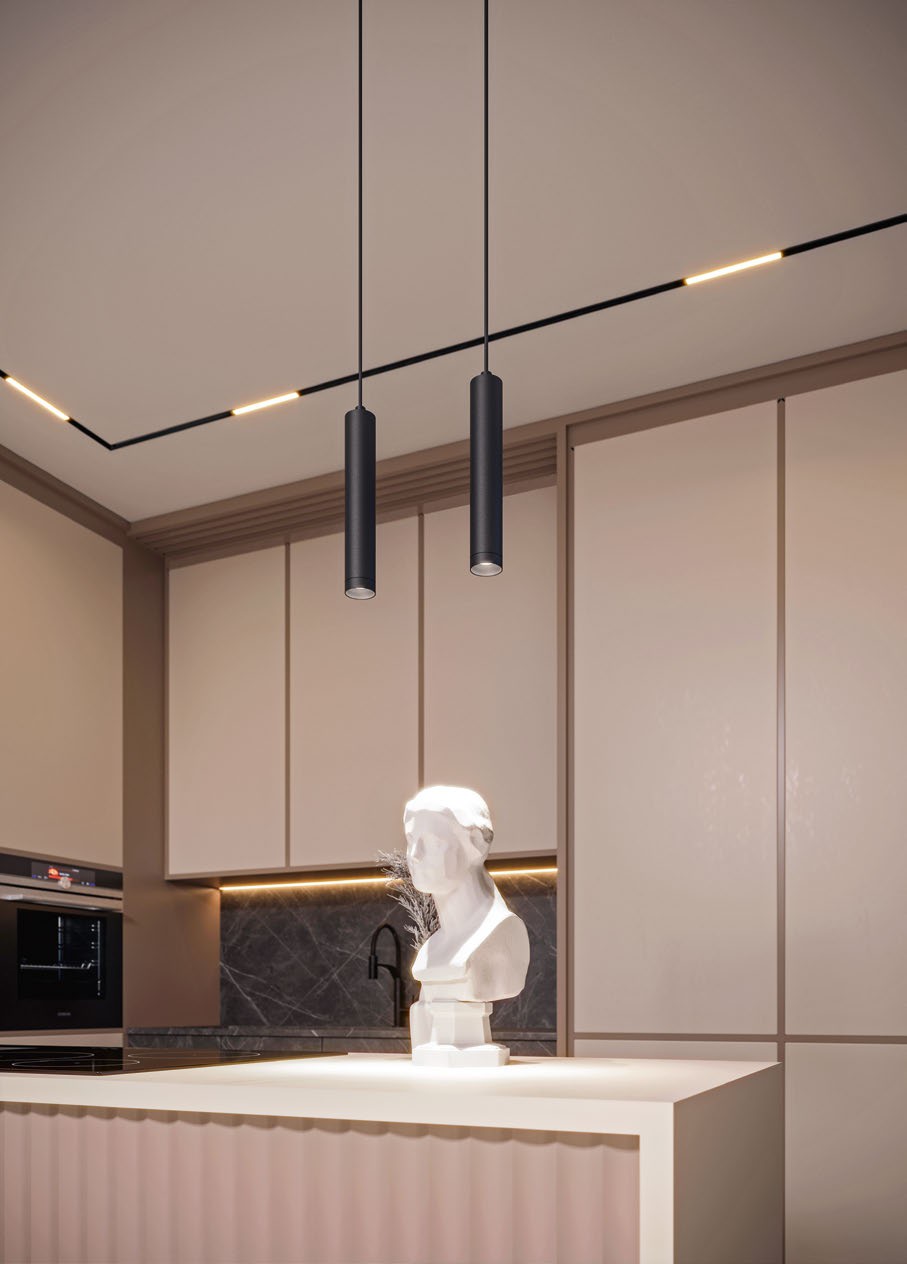 Основное освещение в пространстве кухни создается благодаря встраиваемым в трек светильникам FLAT. Несмотря на визуально компактные размеры светильники FLAT обладают широким углом излучения (80°). За счет особенностей монтажа корпус светильника полностью скрыт за потолком, что придает интерьеру аккуратный и сдержанный вид. Подвесные трековые светильники SPOT HANG не только создают локальное освещение одной из рабочих поверхностей, но и оживляют пространство, придавая объем прямоугольной геометрии.
