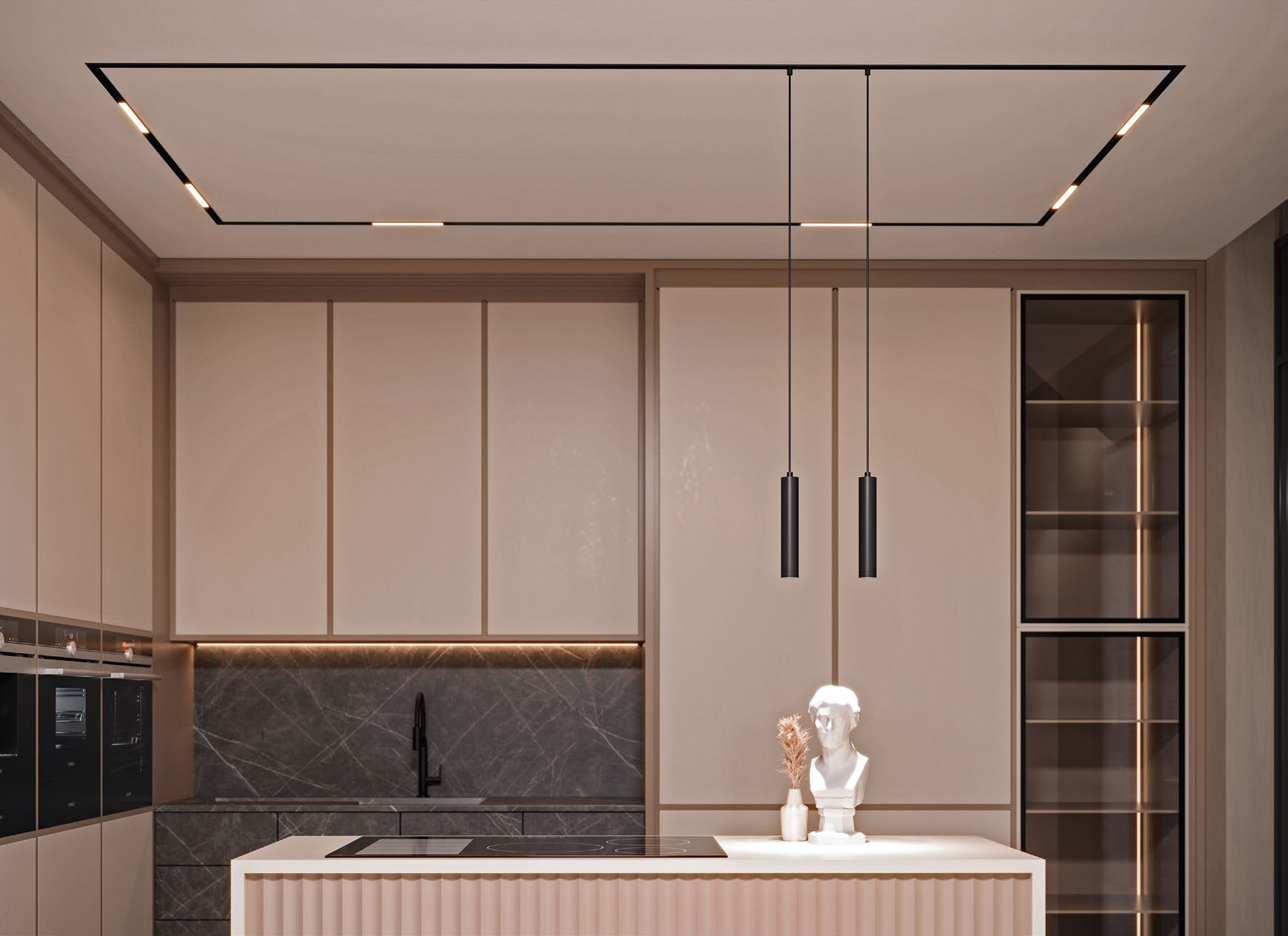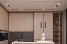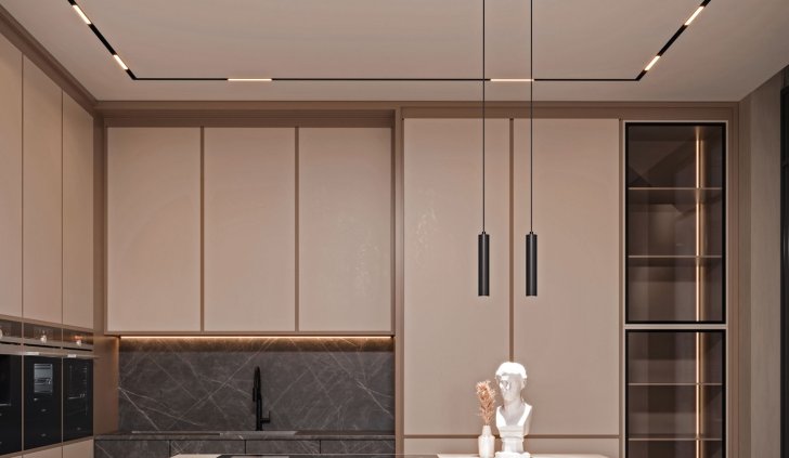 Теплое свечение гармонирует с бежевой цветовой гаммой интерьера, привнося в пространство ощущение уюта. Встроенные треки, образующие на потолке прямоугольные линии, гармонируют с четкой геометрией кухонной мебели.