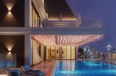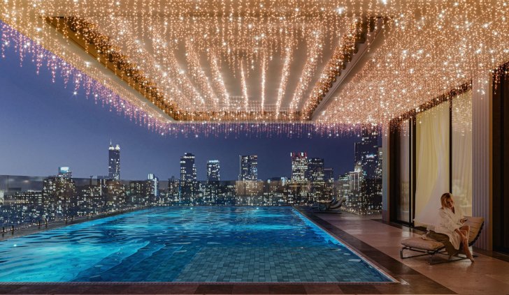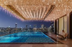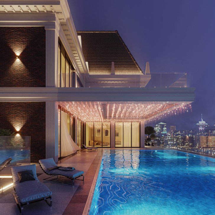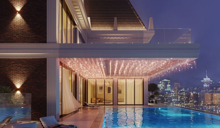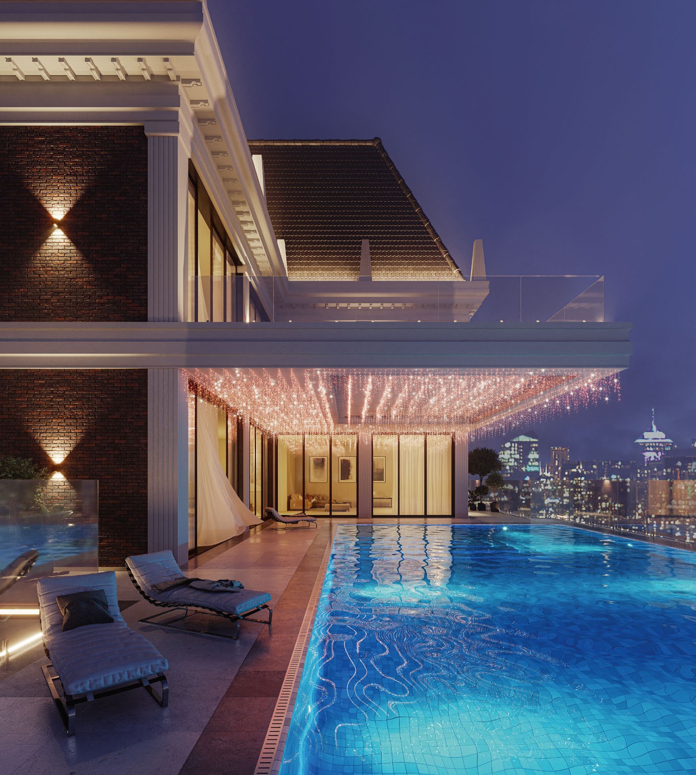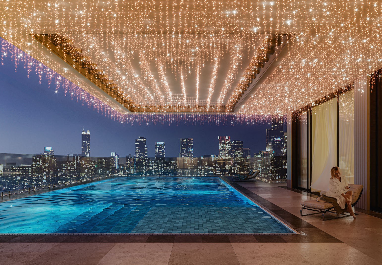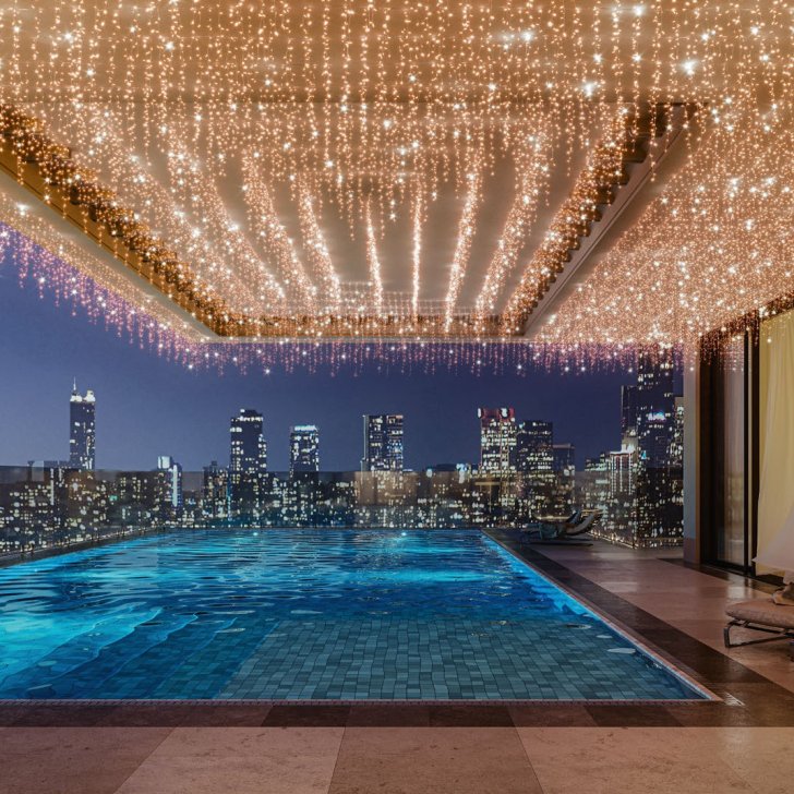 Для создания светового декора козырька использована светодиодная гирлянда EDGE с эффектным оттенком свечения «розовое золото». 24 ниспадающие нити длиной от 20 до 60 см создают роскошный золотисто-переливчатый полог над бассейном.