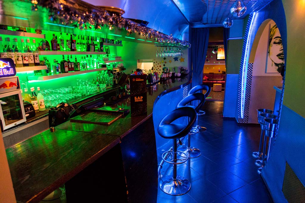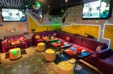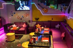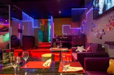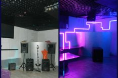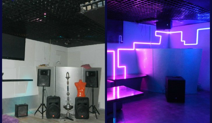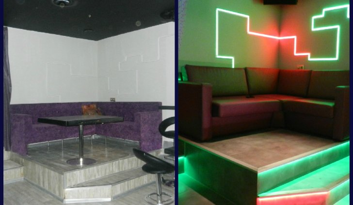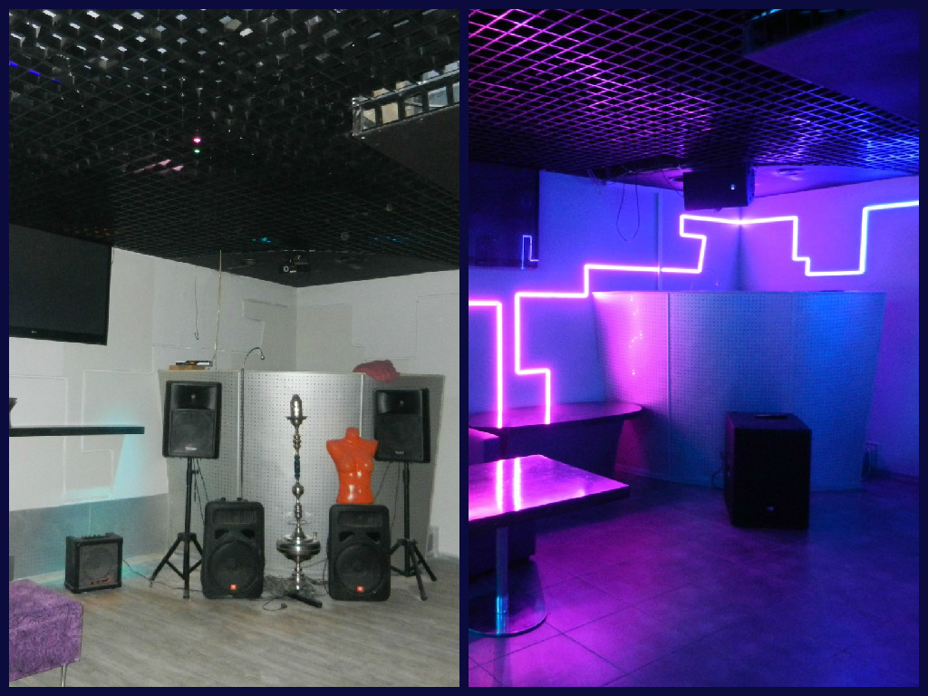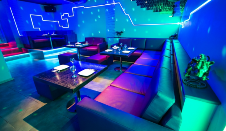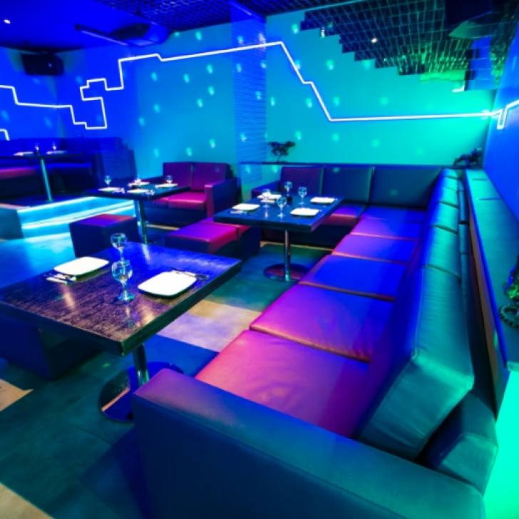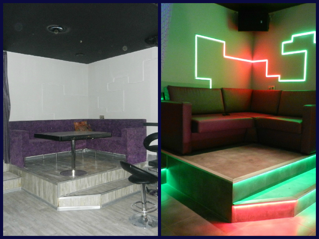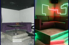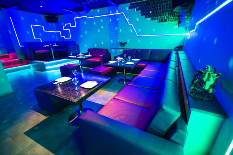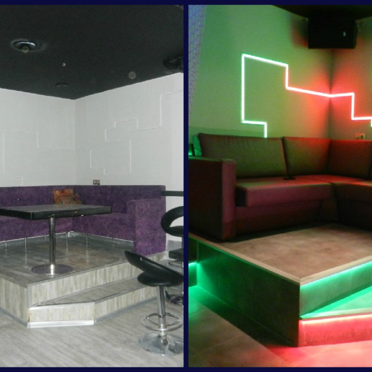 Интерьер представленного бара практически полностью строится на светодиодном освещении. Большинство зон окружено просто серыми стенами, на которых установлены алюминиевые профили, образующие геометрический рисунок. Внутрь профилей установлена особенная RGB-лента Arlight, у которой программируется каждый светодиод, что в сочетании со специальными контроллерами позволяет менять интерьер одним касанием пульта.