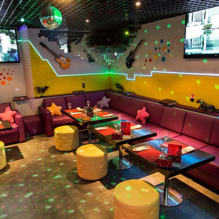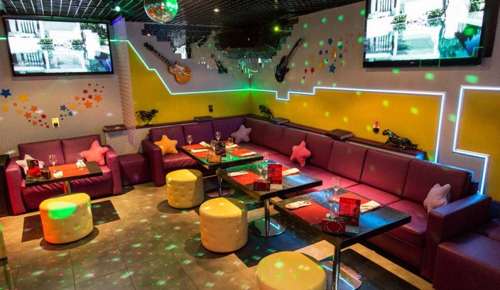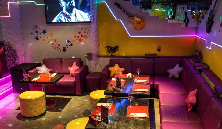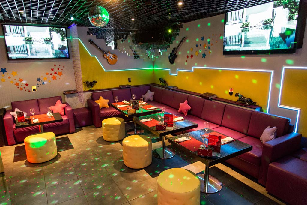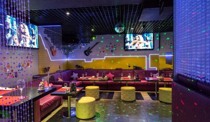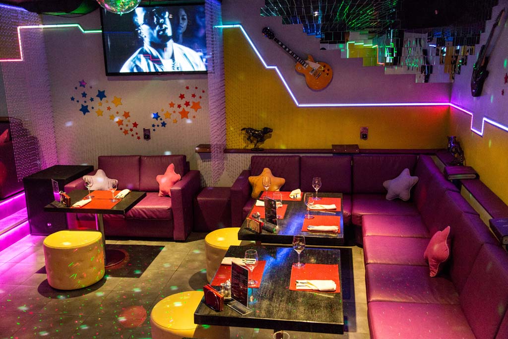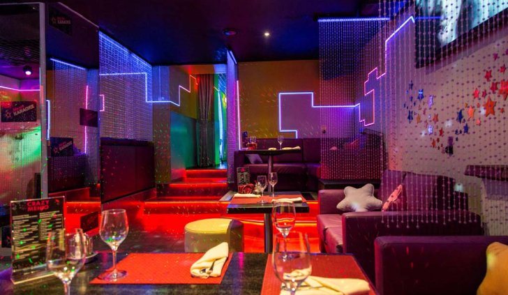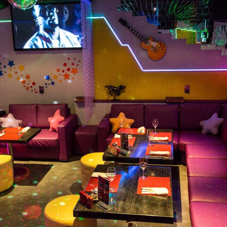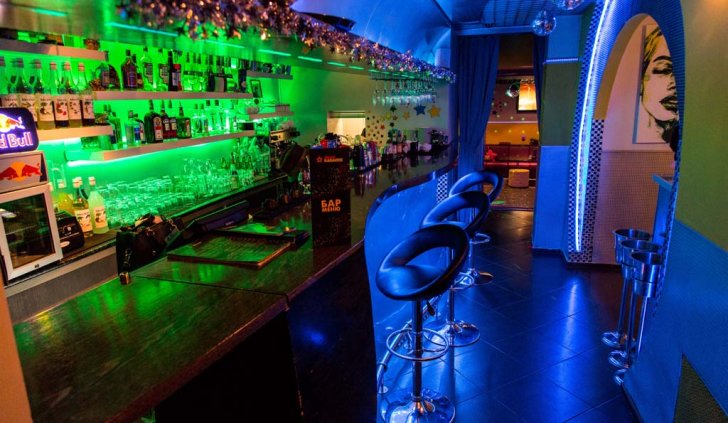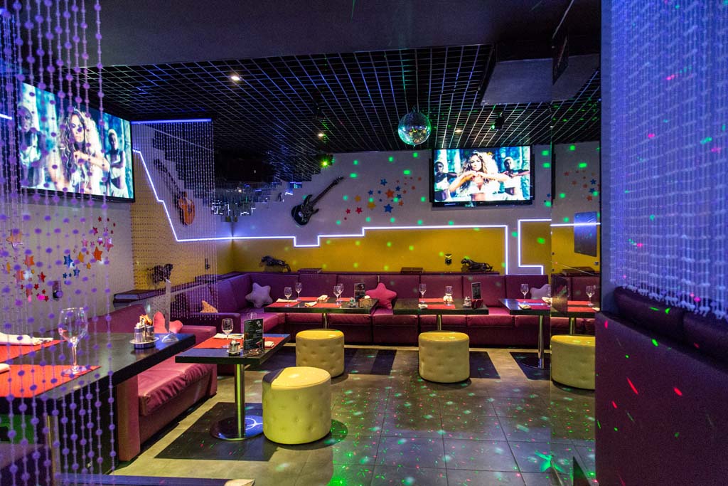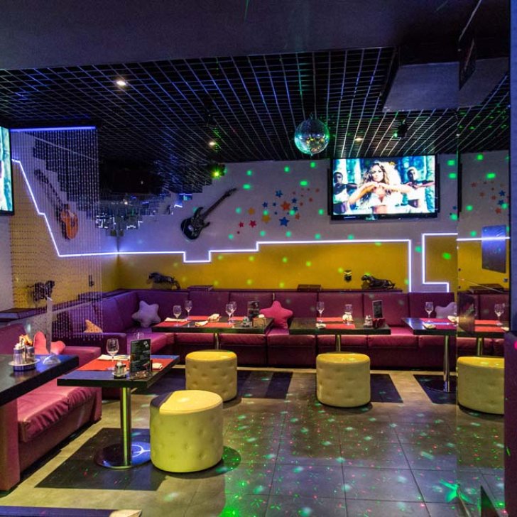 Интерьер представленного бара практически полностью строится на светодиодном освещении. Большинство зон окружено просто серыми стенами, на которых установлены алюминиевые профили, образующие геометрический рисунок. Внутрь профилей установлена особенная RGB-лента Arlight, у которой программируется каждый светодиод, что в сочетании со специальными контроллерами позволяет менять интерьер одним касанием пульта.