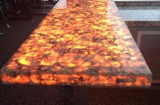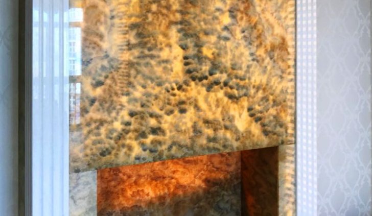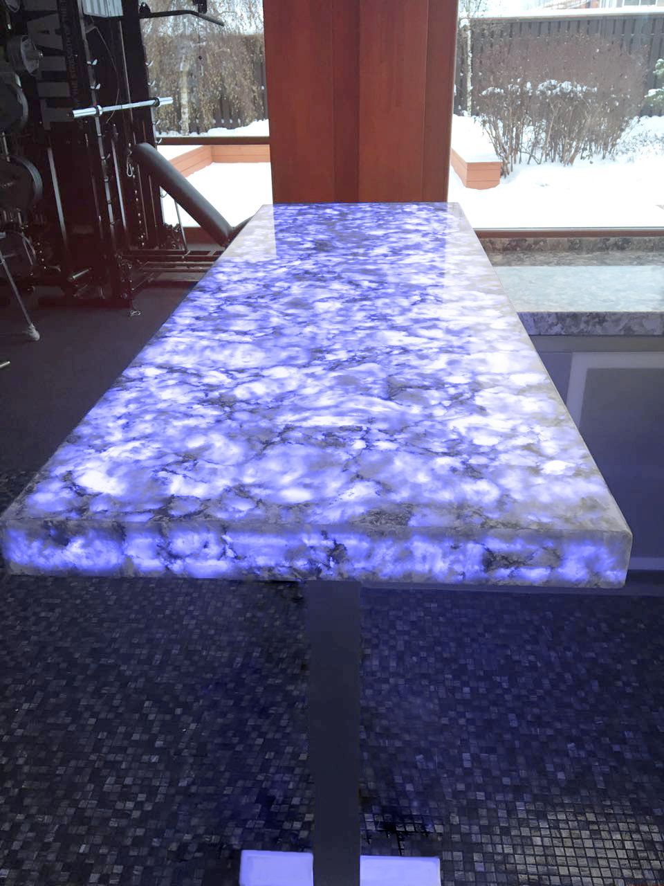 Отдельного внимания заслуживает такое решение, как подсветка натурального камня. Декоративное панно из оникса, плавно переходящее в ниши в санузле, создаёт очень мягкое и тёплое свечение. Такой же приём подсветки камня используется в оформлении каминного портала и барной стойки в спортзале. В последнем варианте используется RGB-лента, с помощью которой можно кардинально менять настроение помещения.