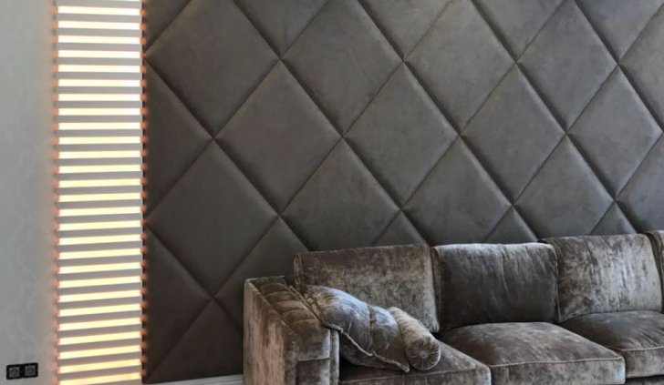 В гостиной по периметру потолка установлена многоцветная подсветка. Мягкая зона с диваном по краям обрамляется светящимися пилястрами. Декоративные ниши со стеклянными полочками, будто явившиеся из восточной сказки, также привлекают к себе внимание мягкой подсветкой.