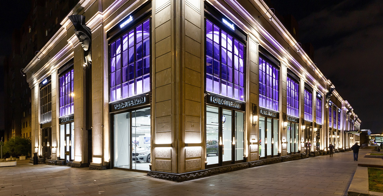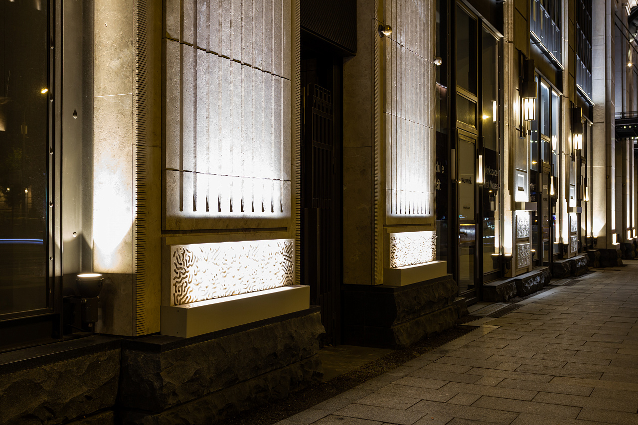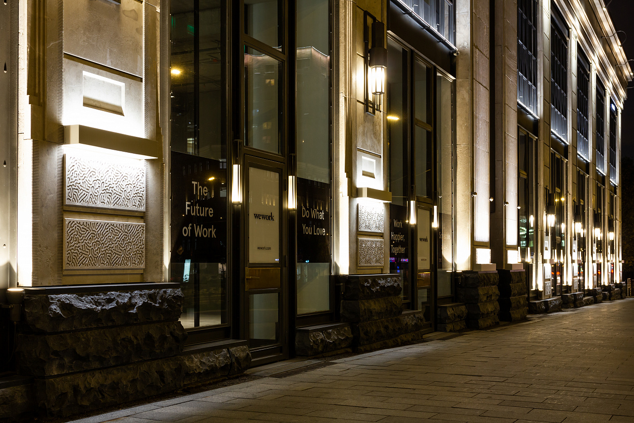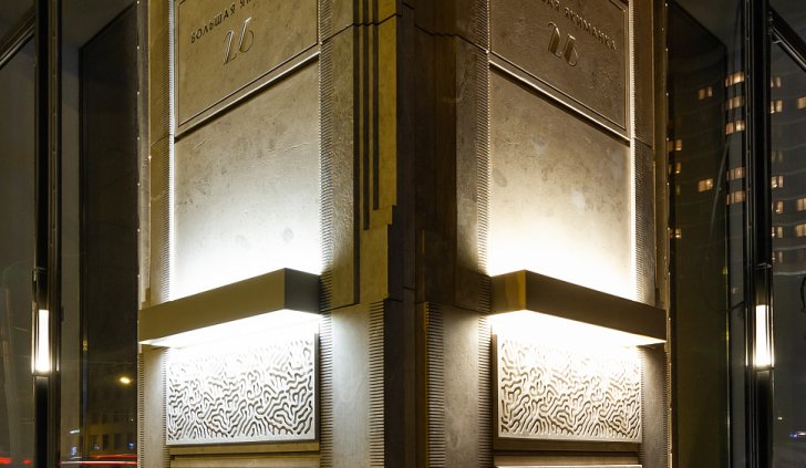 Архитектурное освещение ТЦ "Большая Якиманка" в вечернее время создаёт праздничное настроение и выгодно подчёркивает статусный облик здания. Светодиодная подсветка, оформленная в алюминиевые профили с матовыми экранами сверху и снизу, акцентирует внимание на разнообразии фактуры стен, а также выполняют вспомогательную роль в качестве уличного освещения.