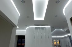 В проекте использовалась яркая лента Arlight smd 3528 холодного белого цвета. Большая плотность светодиодов (120 шт./м) позволила дать достаточно много света. Для создания полноценного основного освещения в совокупности с лентами, были установлены светильники-споты со светодиодными лампами GX53.