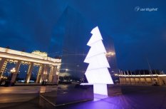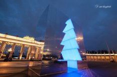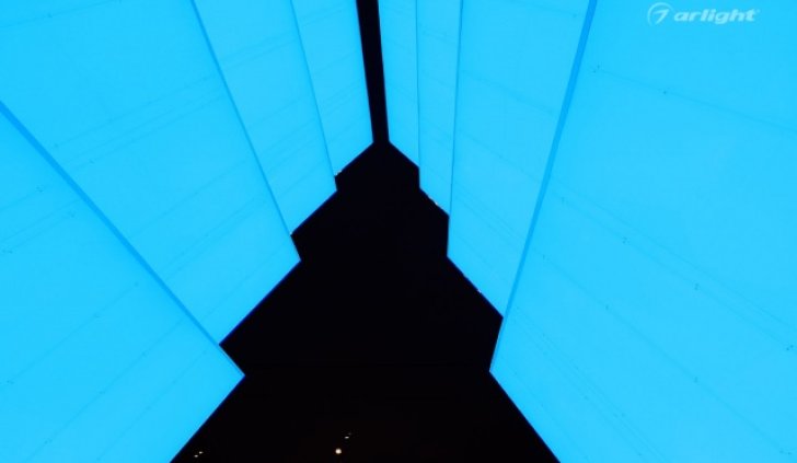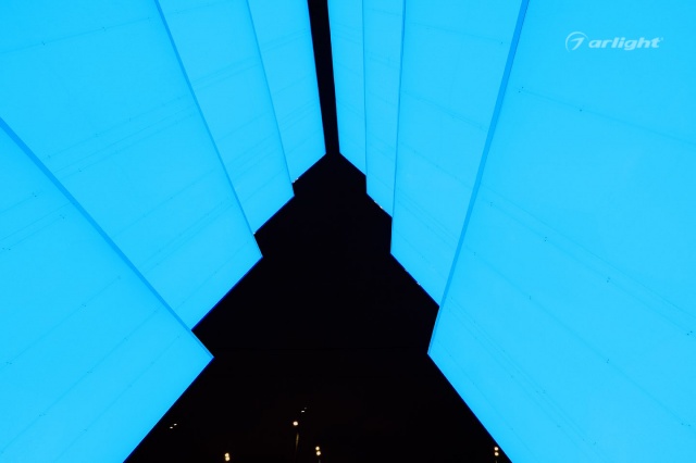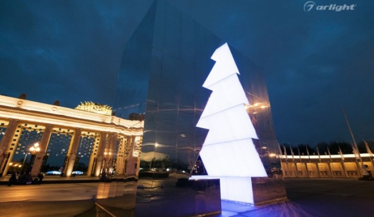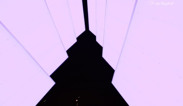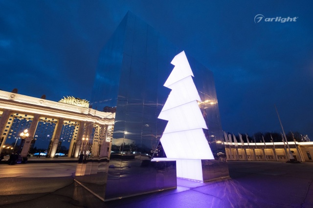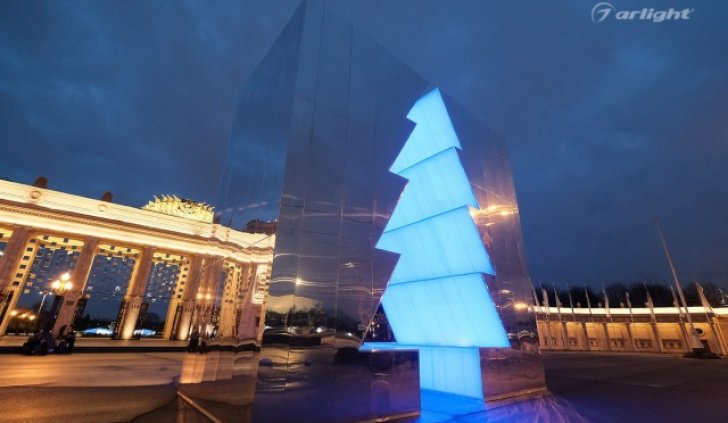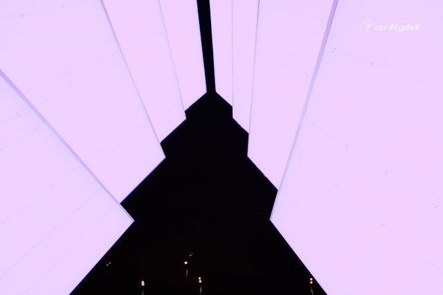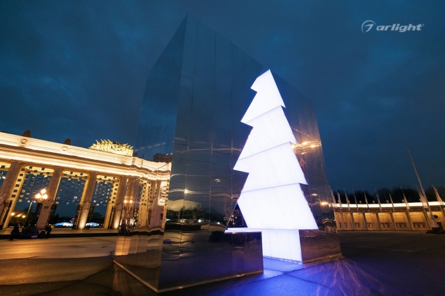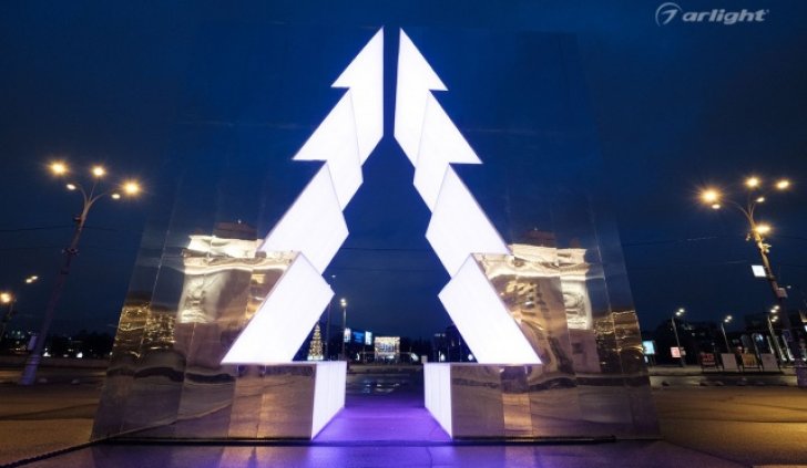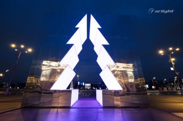 Внутренняя поверхность инсталляции – это светопрозрачный матовый материал, за которым равномерными рядами наклеена многоцветная светодиодная лента SPI Arlight. Светодинамические эффекты и блеск зеркальных граней добавляли праздничного настроения жителям города.