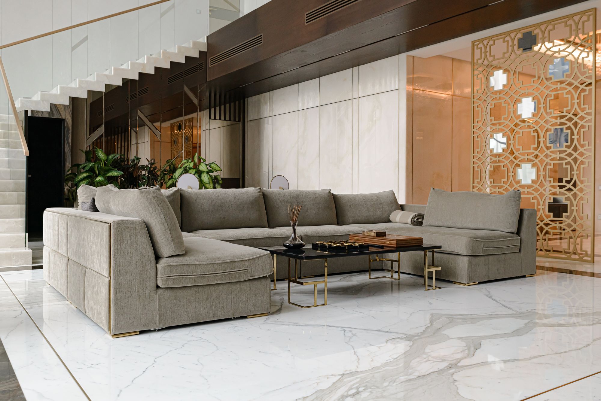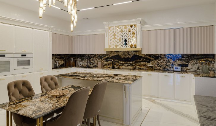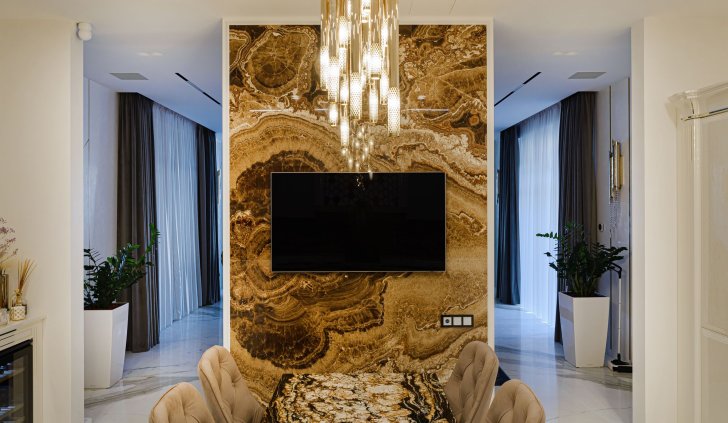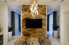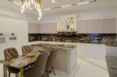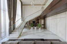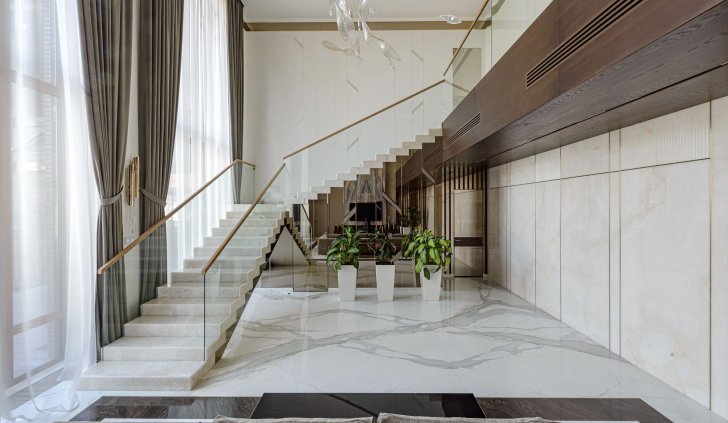 Интерьер частного трехэтажного дома выполнен в современном классическом стиле, сочетающем роскошь классицизма с практичностью современности.