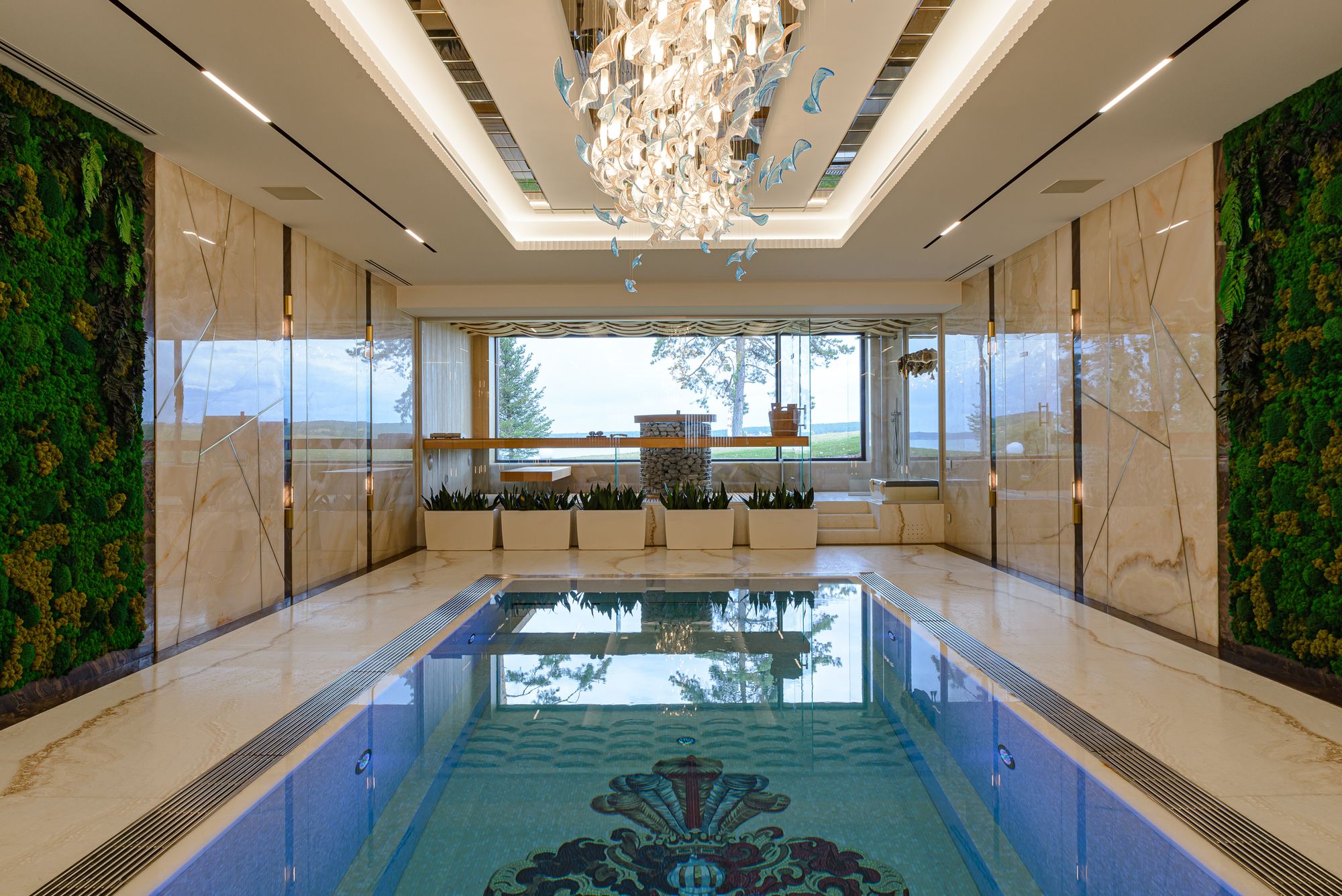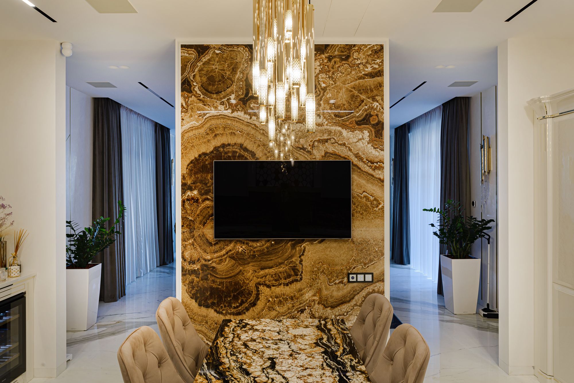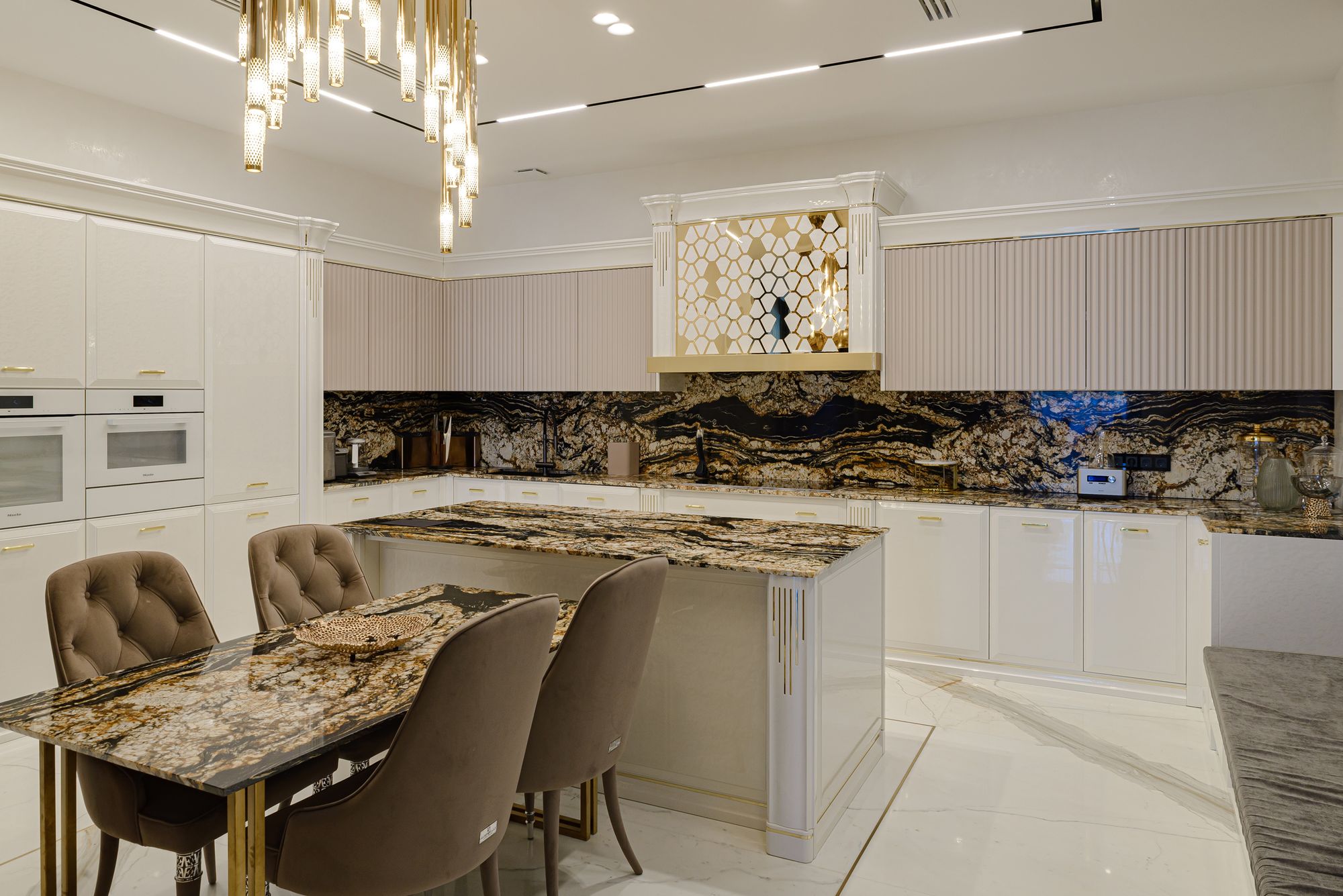 Такая концепция распространяется и на освещение. В помещении прекрасно сочетаются декоративные люстры и светильники с функциональными трековыми системами. Встроенные в потолок треки и светильники выделяют роскошные декоративные люстры, при этом периметр комнаты обеспечивается хорошей освещенностью благодаря трековым системам, исключая темные углы.