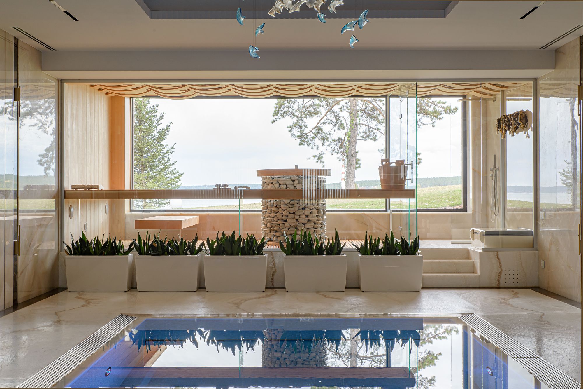 В каждом помещении была подобрана декоративная люстра, соответствующая интерьеру и назначению помещения, в то время как встроенные трековые системы с встроенными светильниками являются постоянным элементом. Они придают единство пространству дома и определяют направление движения.