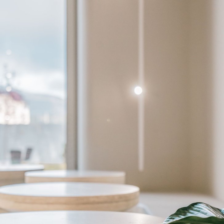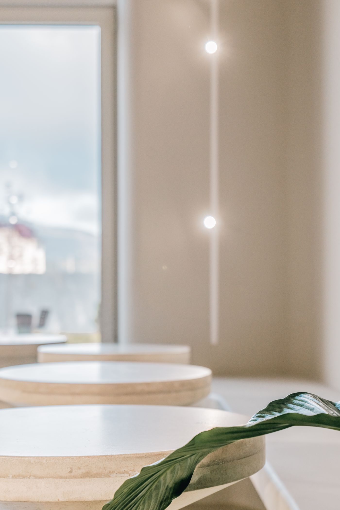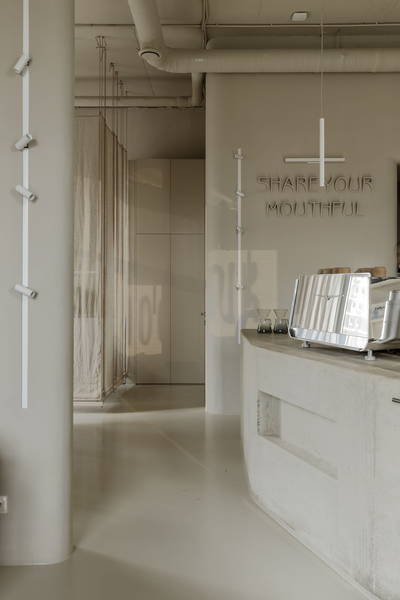 Концепция интерьера кофейни "MONK" находит соответствие своему названию. С одной стороны, уникальное оформление, преобладание бетонных элементов и равномерное молочно-белое цветовое решение создают аскетичную атмосферу. Однако, посещая это место, гости ощущают спокойствие и умиротворение, словно находятся в античном храме.