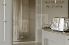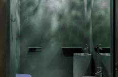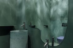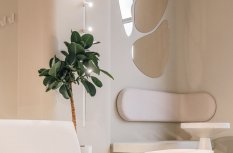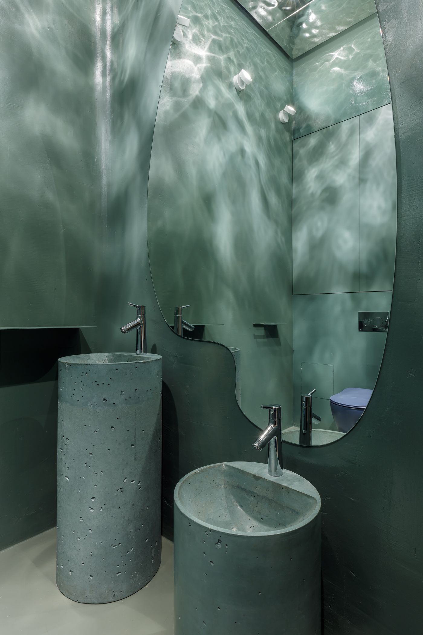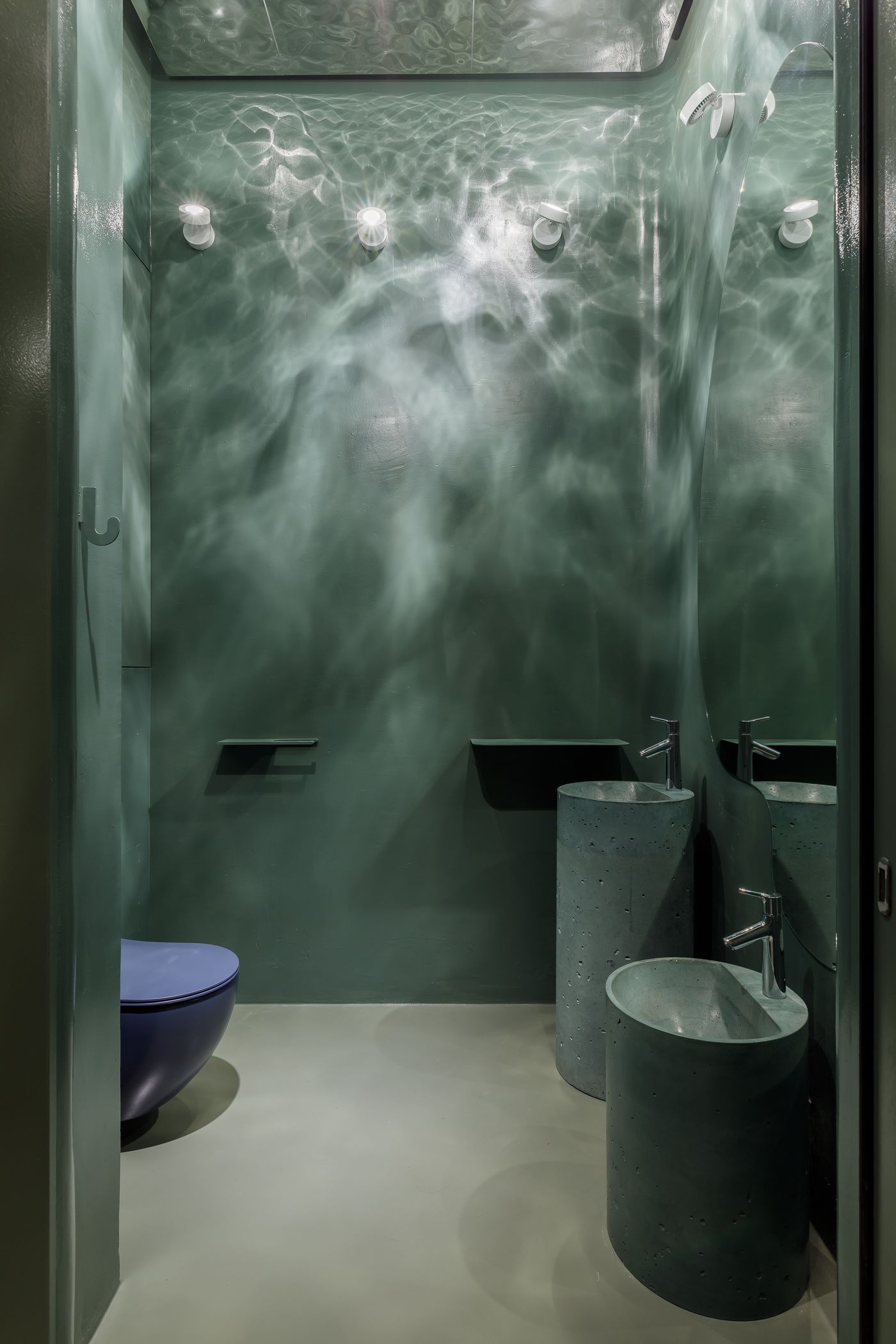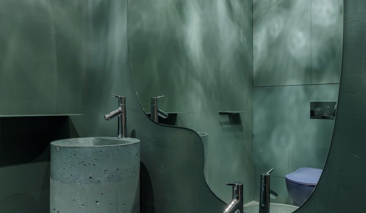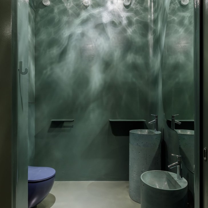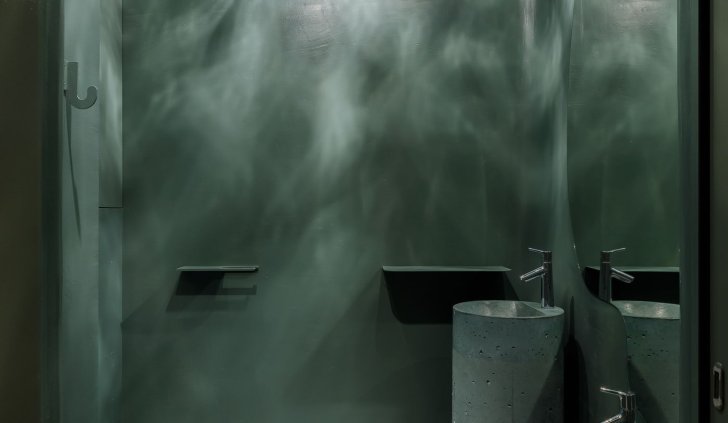 Интерьер санузла также излучает водные мотивы, при этом производя ощущение пространства. Гости почти будто оказываются под водой, и это не только благодаря однотонной серо-зеленой цветовой гамме. Светильники SP MONA SURFACE с поворотным корпусом направлены на рельефный потолок с зеркальной поверхностью, создавая игривые блики и рисунки в помещении.
