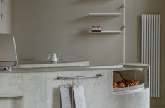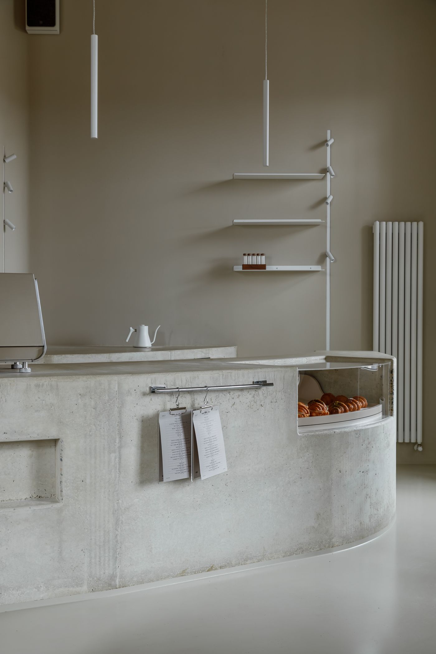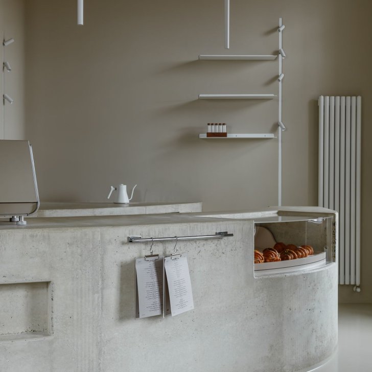 Оригинальные детали интерьера разбавляют общий минималистический стиль. Расположение кофейни рядом с морем вдохновило создать стол с бетонной столешницей, имитирующей рельеф морского дна и покрытой гладким зеленоватым стеклом.