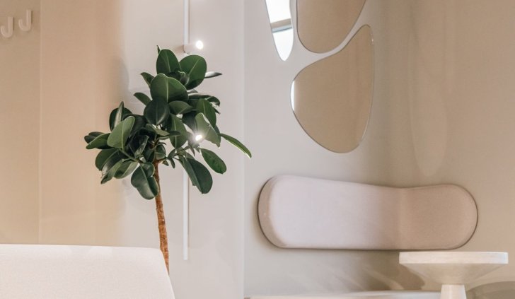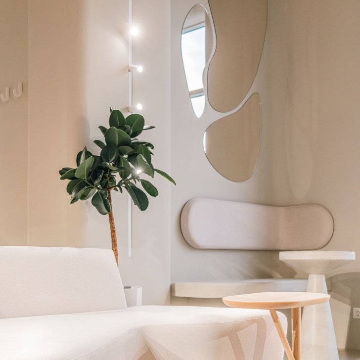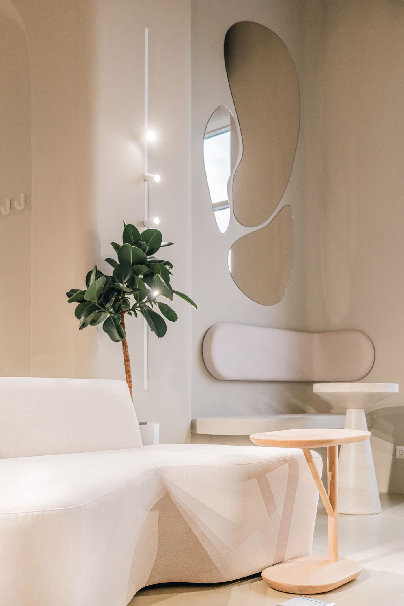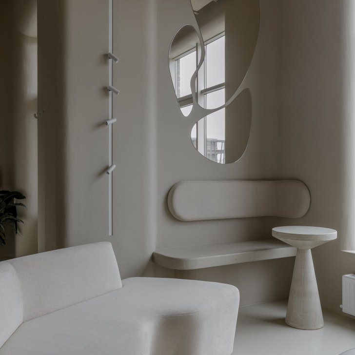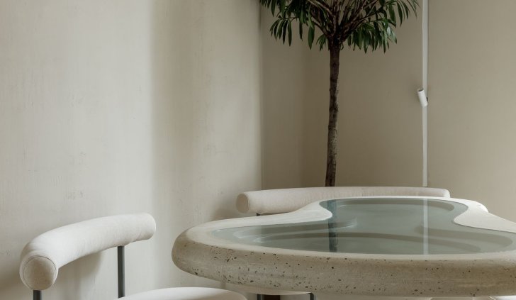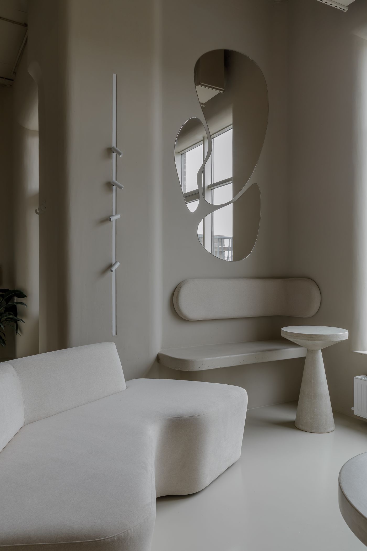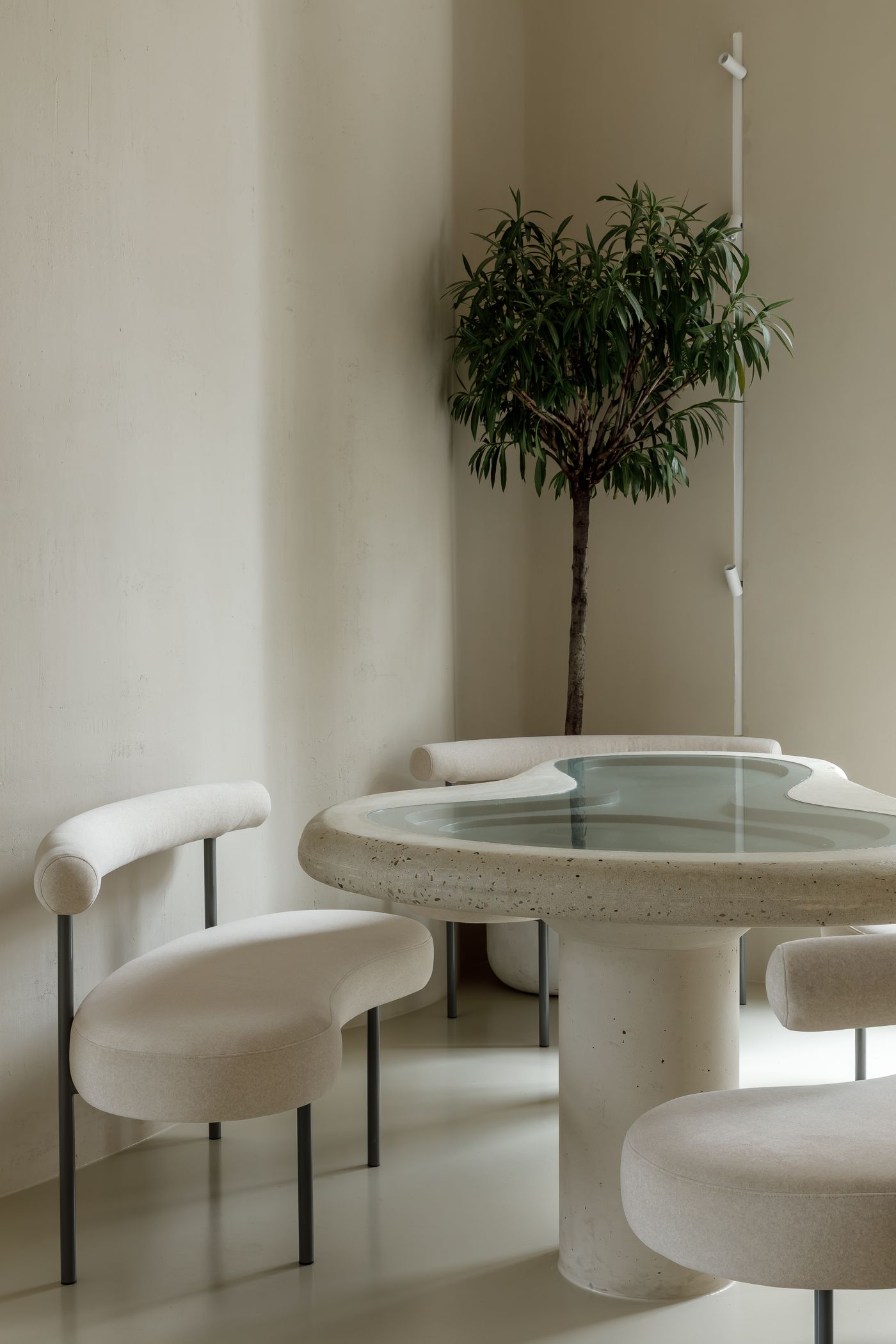 Специально созданные округлые формы мебели играют большую роль в достижении такого эффекта. Отсутствие резких углов придает интерьеру уют. Этот характерный комфорт также распространяется на использованные материалы: наливной пол из полимера имеет гладкую поверхность, а бетонные лавочки и столики снабжены мягкими текстильными подушками.