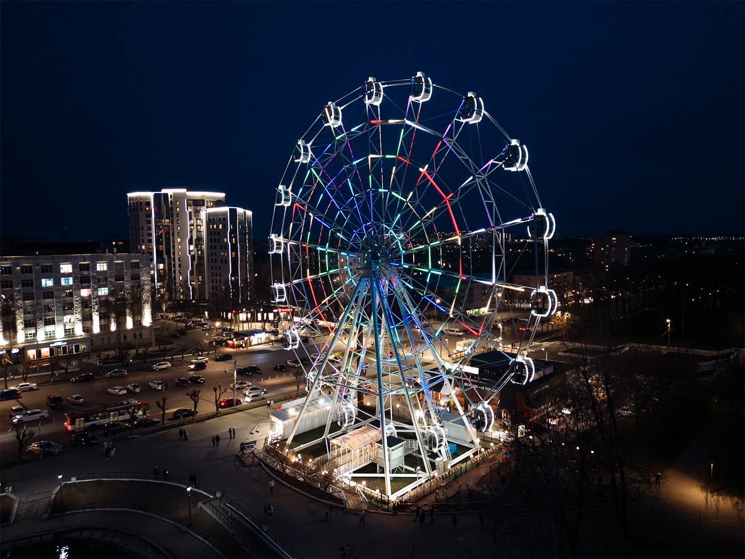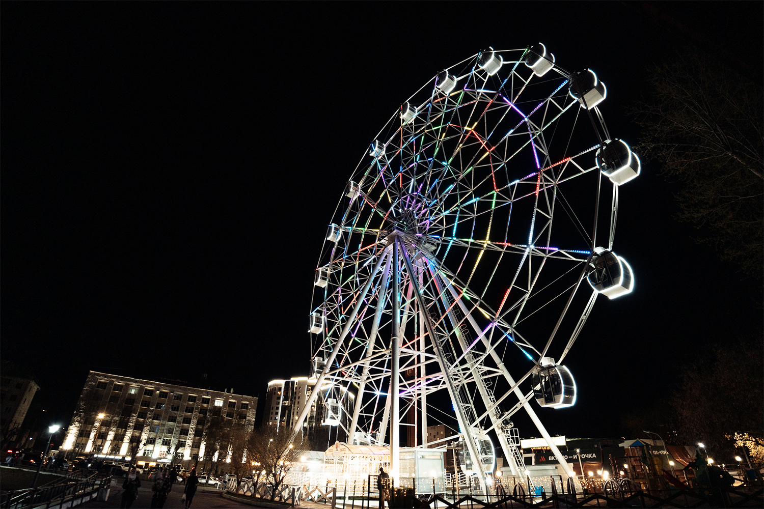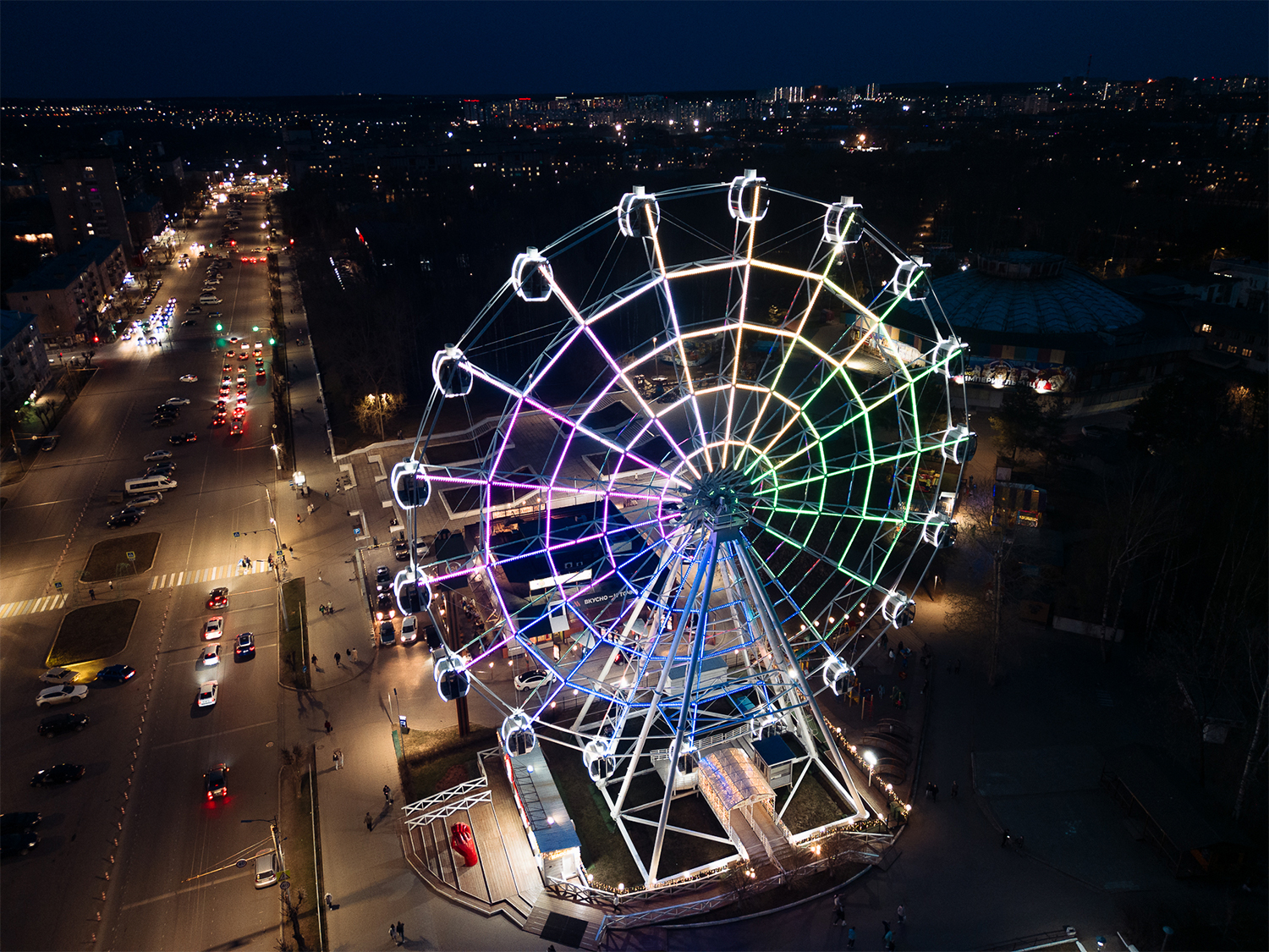 Колесо обозрения "Дымковская радость" не только предлагает удивительные виды на город с высоты 50 метров, но и является прекрасным украшением центральной части Кирова.