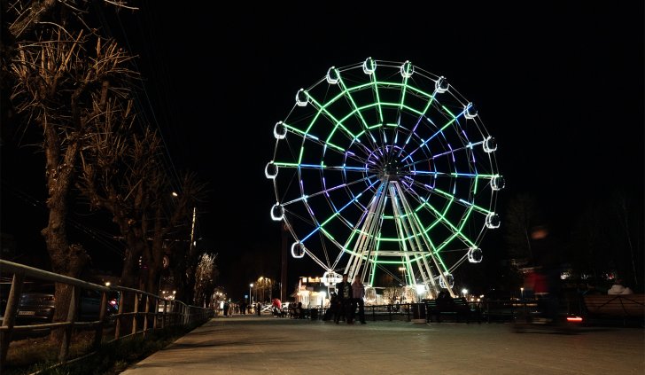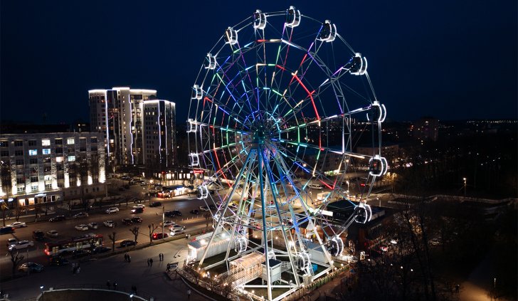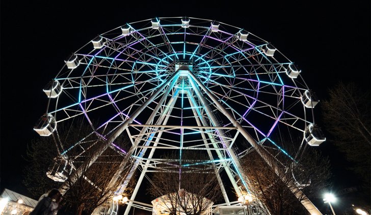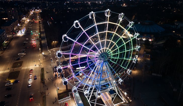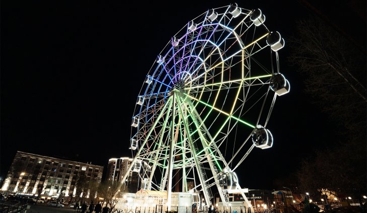 В вечернее время колесо обозрения окутывается многоцветным светом, созданным с помощью 3600 управляемых RGB-модулей. Эти уникальные и динамичные эффекты придают жизнь аттракциону, каждую секунду создавая новый вид. Модули имеют высокую степень защиты от пыли и влаги (IP68) и способны работать в широком диапазоне температур, выдерживая самые неблагоприятные погодные условия.
