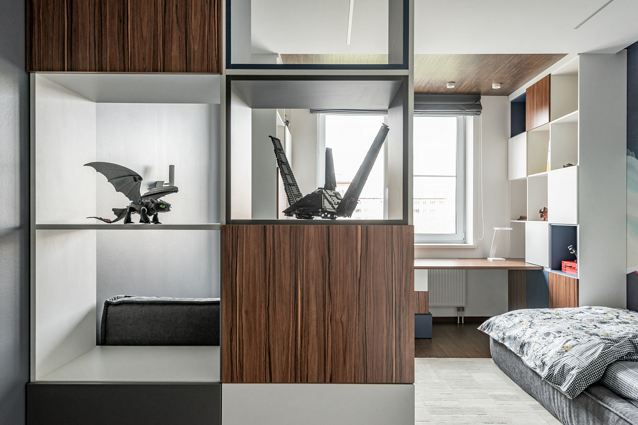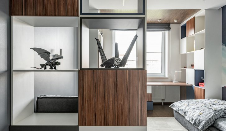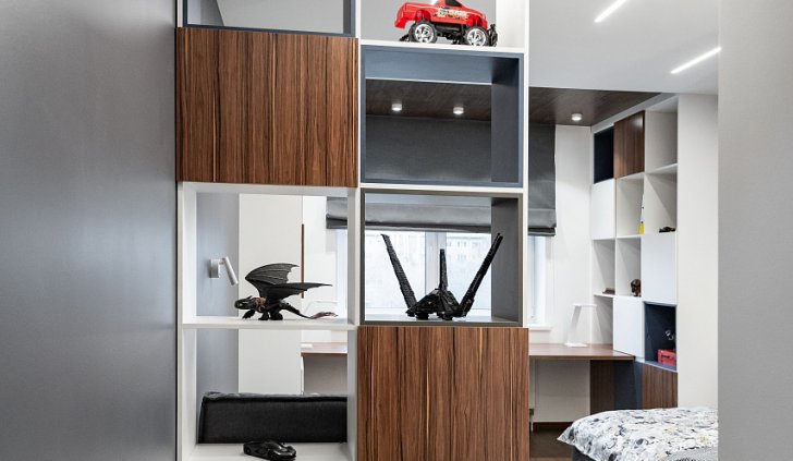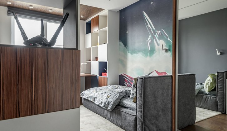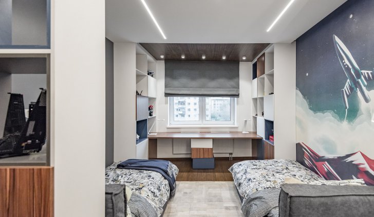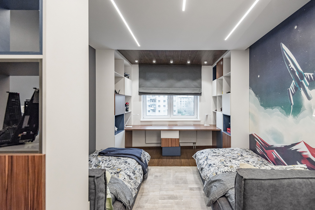 В детской комнате в ЖК «Москва» в Екатеринбурге световые линии использовались для основного освещения. Именно поэтому были выбраны модели лент с высокой плотностью размещения светодиодов на плате. Высокая мощность обеспечивает достаточно яркое световое пространство, а матовый экран со светопропусканием до 70% дает мягкое рассеивание. Свет от светодиодов не слепит и не вызывает дискомфорт.