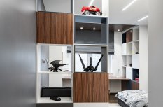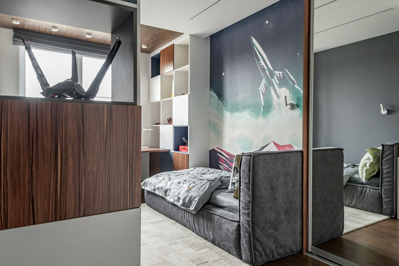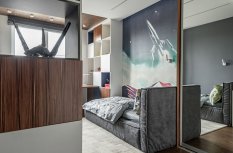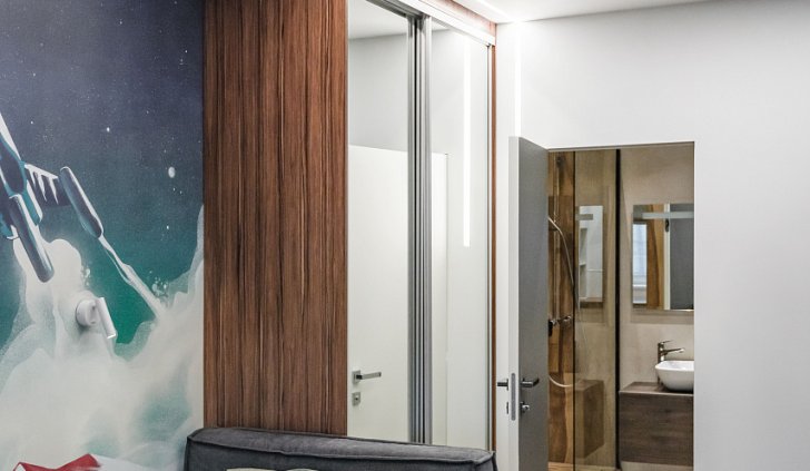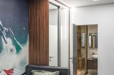 Интересным дизайнерским решением стал переход потолочных линий света на стену около шкафа-купе. Таким образом создается функциональная лаконичная подсветка зеркальных дверей шкафа.