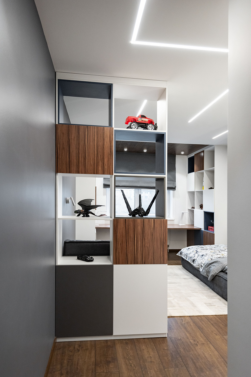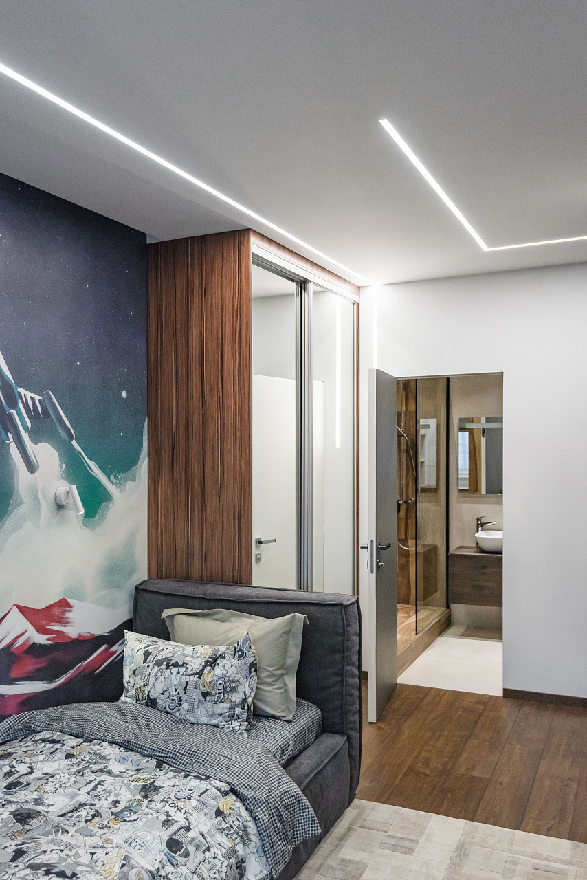 В целом, графичные световые линии подчеркнули лаконичный стиль комнаты, но при этом продолжили идею движения в интерьере.