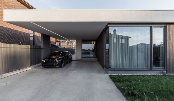 Одноэтажный коттедж в стиле хай-тек, выполненный в минималистичной манере, представляет собой своеобразный оазис прохлады среди жарких солнечных лучей Краснодара. Массивная плоская крыша словно покоится на здании, прикрывая террасу и гараж, что предотвращает непосредственное попадание солнечных лучей внутрь дома.