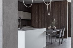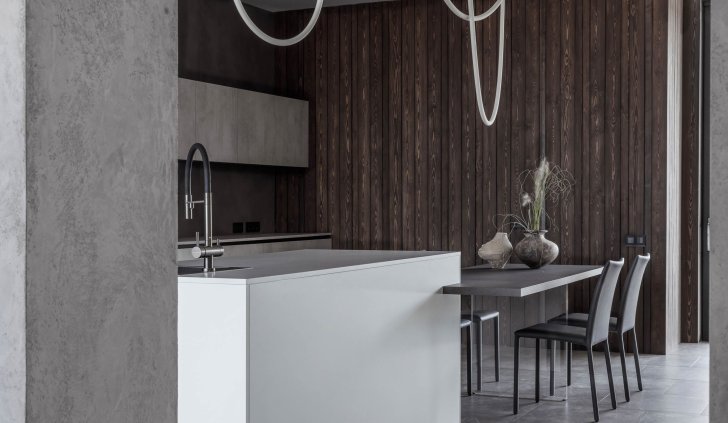 Внутреннее пространство коттеджа идеально подходит для укрытия от жары. Серая цветовая палитра придает интерьеру прохладу, а размытая текстура на полу и стенах напоминает о приятной прохладе натурального мрамора.
