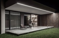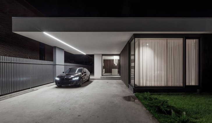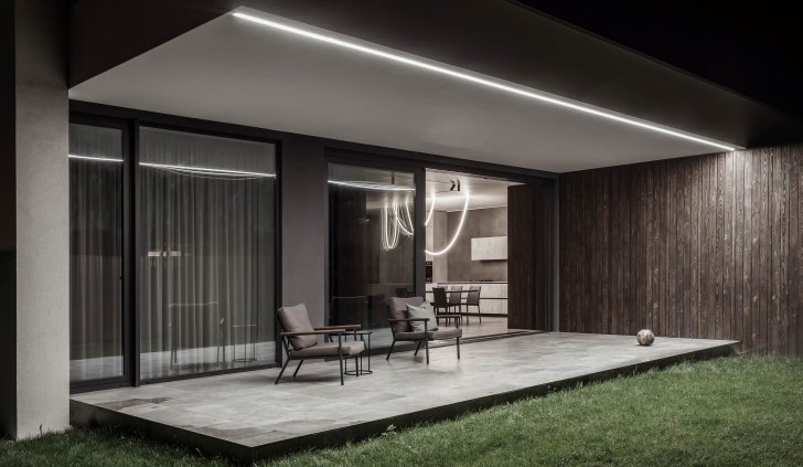 Когда наступает вечер, автостоянка и терраса подсвечиваются интегрированной световой линией в козырьке. Прямые линии света явно подчеркивают геометрию и строгость хай-тек стиля.