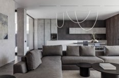 Для сохранения минималистической концепции интерьера были выбраны лаконичные источники света. В санузлах и детской комнате используются встроенные линейные источники света на основе скрытого профиля. В гостиной применяется магнитная система трекового освещения, которая гармонично встроена в потолок, соответствуя общему стилю. Гибкость системы позволяет перемещать светильники вдоль трека, создавая разнообразные световые акценты в интерьере.