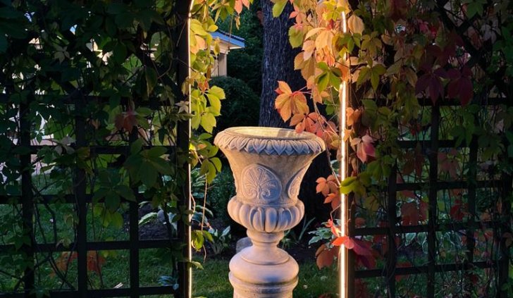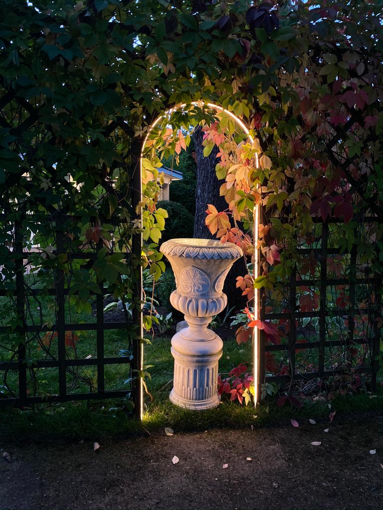 Для оформления фасада дома и подсветки декоративной арки в саду была использована герметичная лента со сплошным излучением по всей длине. Это простое, но эффективное решение придает участку роскошный и впечатляющий вид.