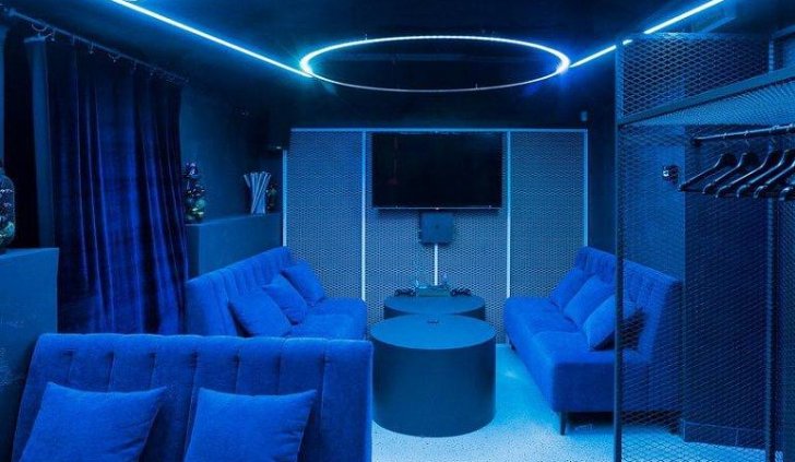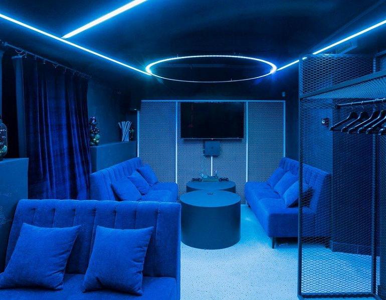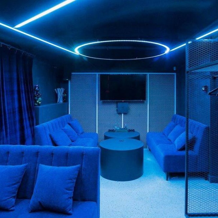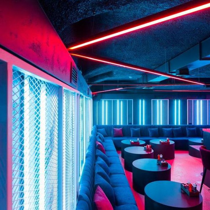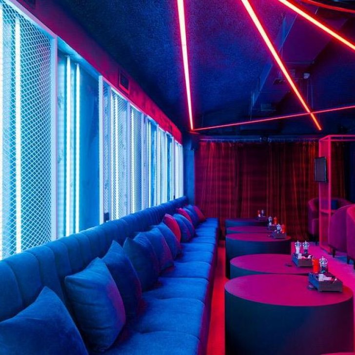 Дополнительное освещение установлено на стенах. Парные вертикальные полосы сочетаются с потолочным освещением и подчёркивают характер ночного заведения.