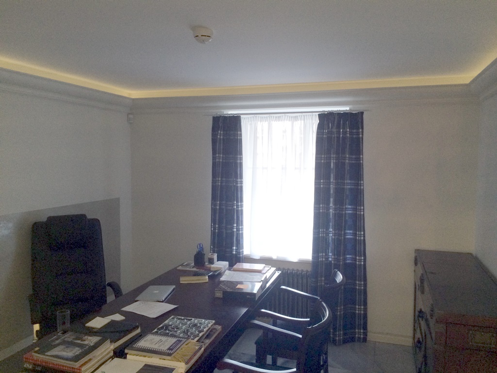 Для этого использовалась светодиодная лента SDM 5630 Arlight и напряжением 24В. Она была размещена за полиуретановыми карнизами по всей площади помещения и направлена вверх. Ленту установили в алюминиевый прозрачный профиль для более удобной уборки и непосредственной защиты от пыли.