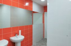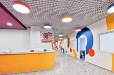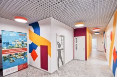 Для спортзала и учебных классов отлично подошли светодиодные панели серии TITAN с прямой равномерной засветкой. В санузлах использованы встраиваемые светильники RONDO, отличающиеся высокой светоэффективностью. Совершенно органично вписались в яркий интерьер холла подвесные светильники TOR в корпусах желтого, красного и синего цветов. Они создают живое светоцветовое пространство, создавая позитивную атмосферу в школе.