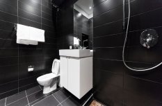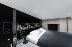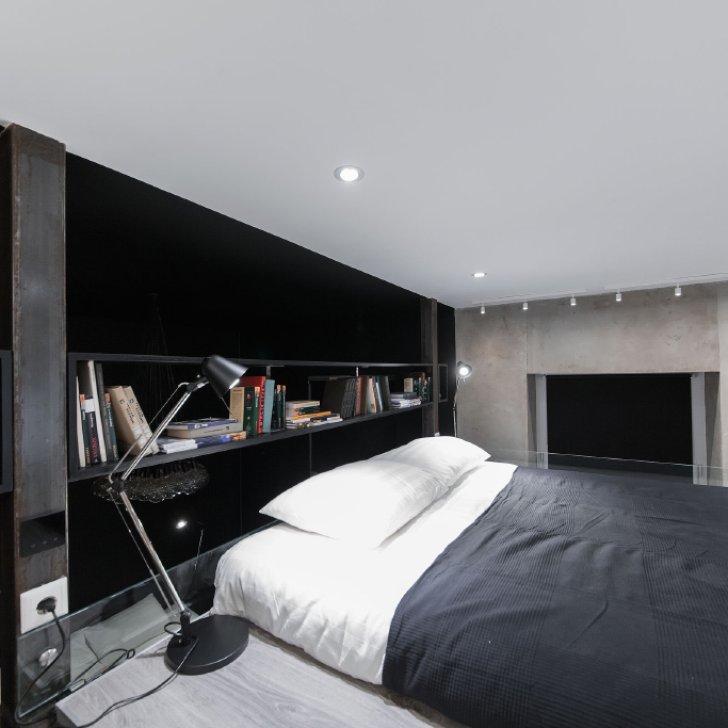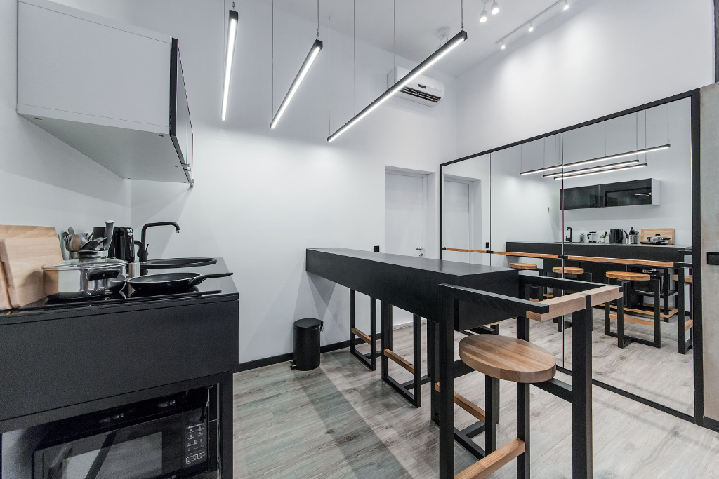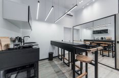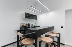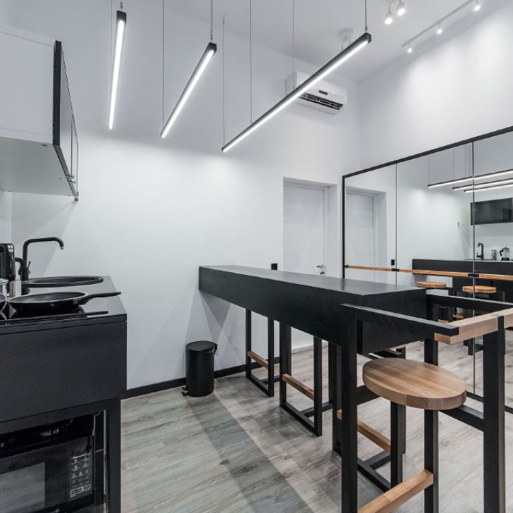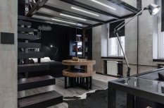 Для освещения отдельных зон студии, а именно кухни и рабочей зоны, были применены светодиодные линии света, которые отлично вписались в общую стилистику интерьера.