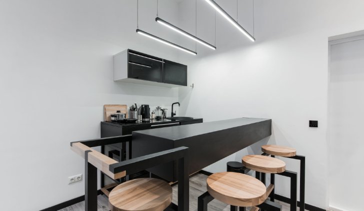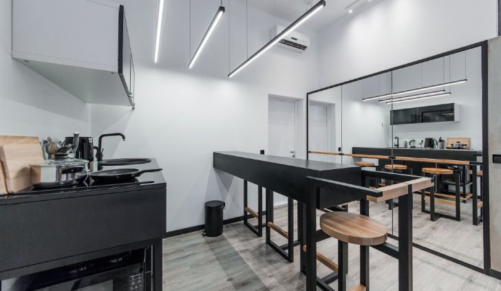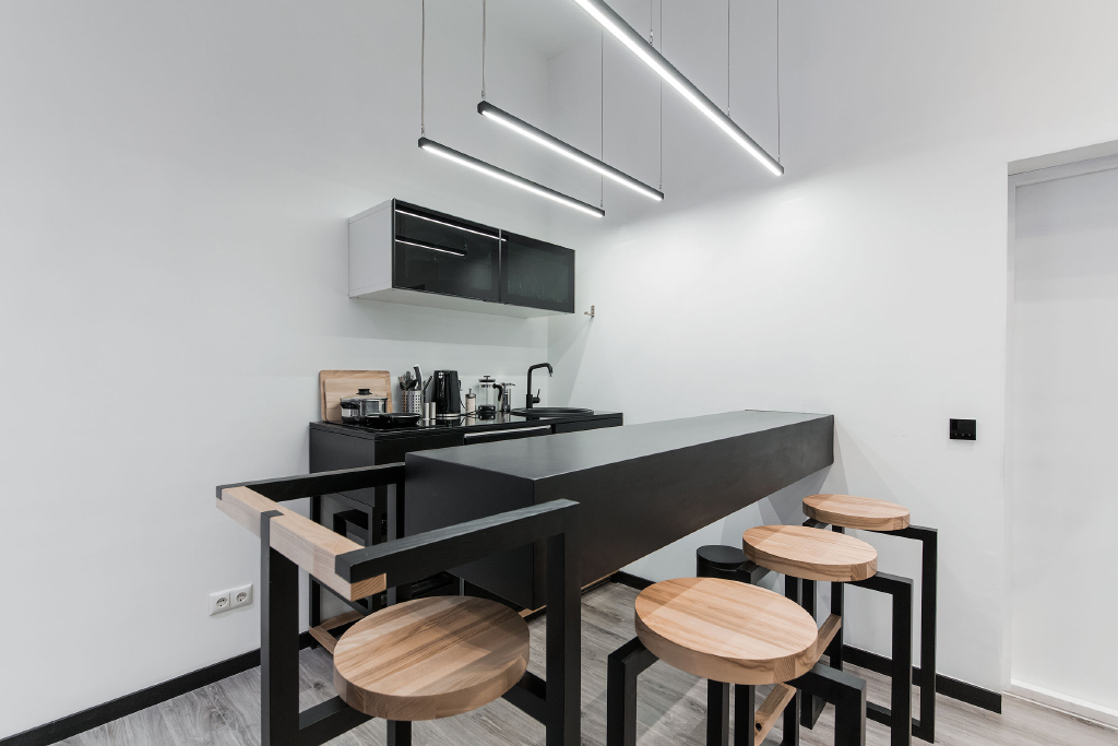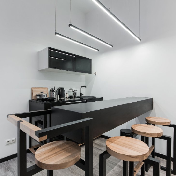 На кухне и в обеденной зоне использованы более крупные светодиодные светильники. Их установили на оптимальной высоте при помощи тонких металлических подвесов.