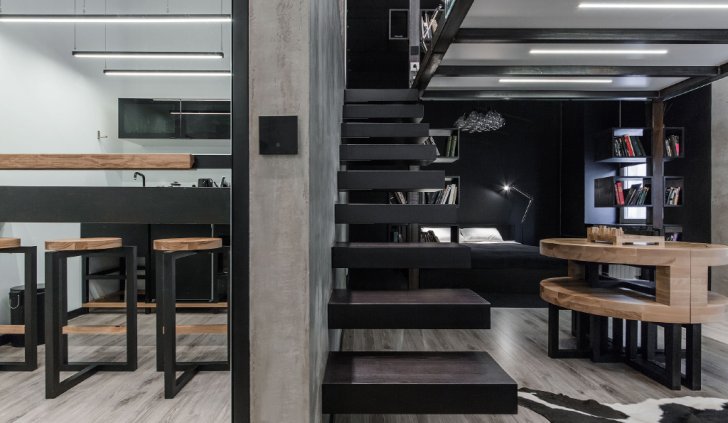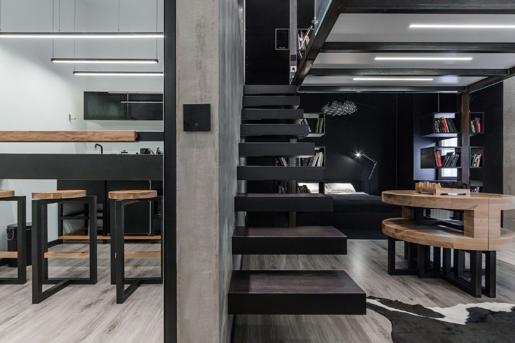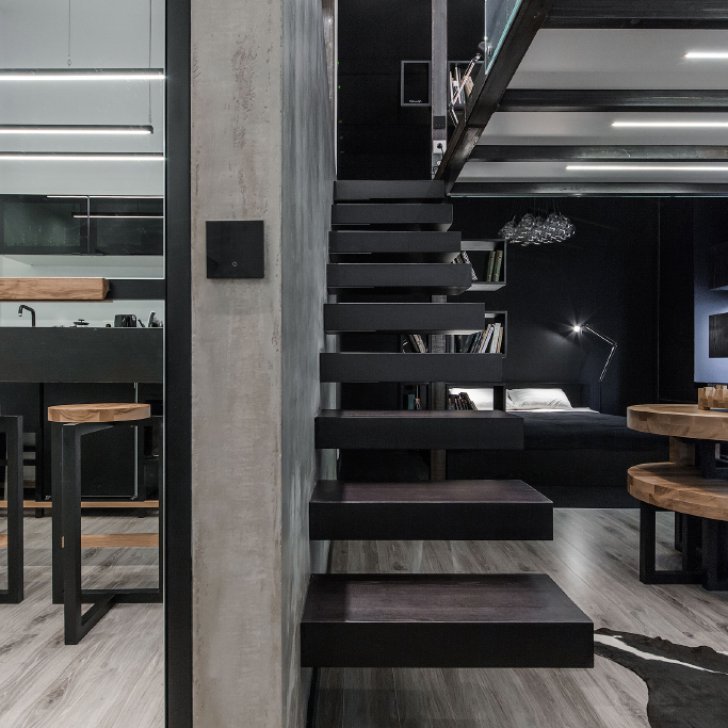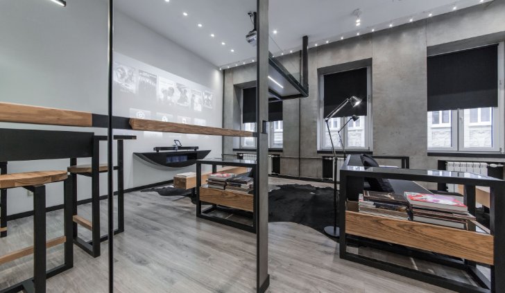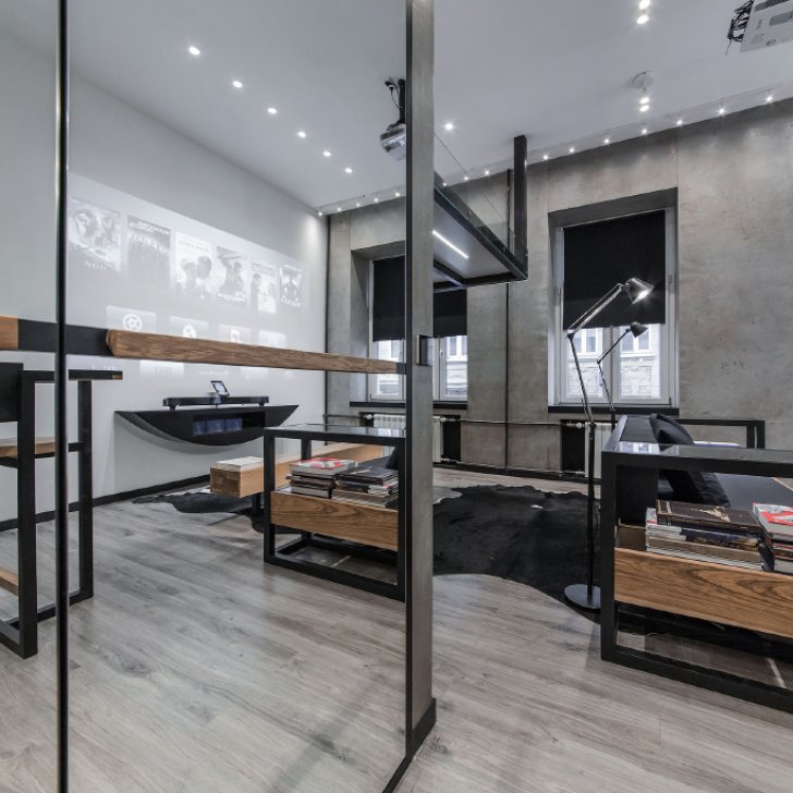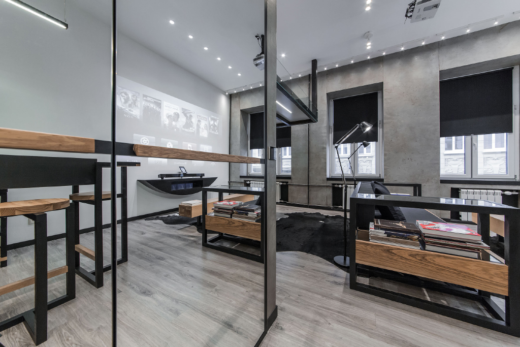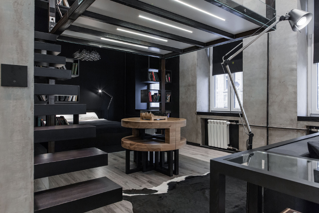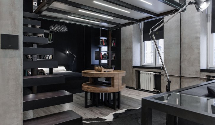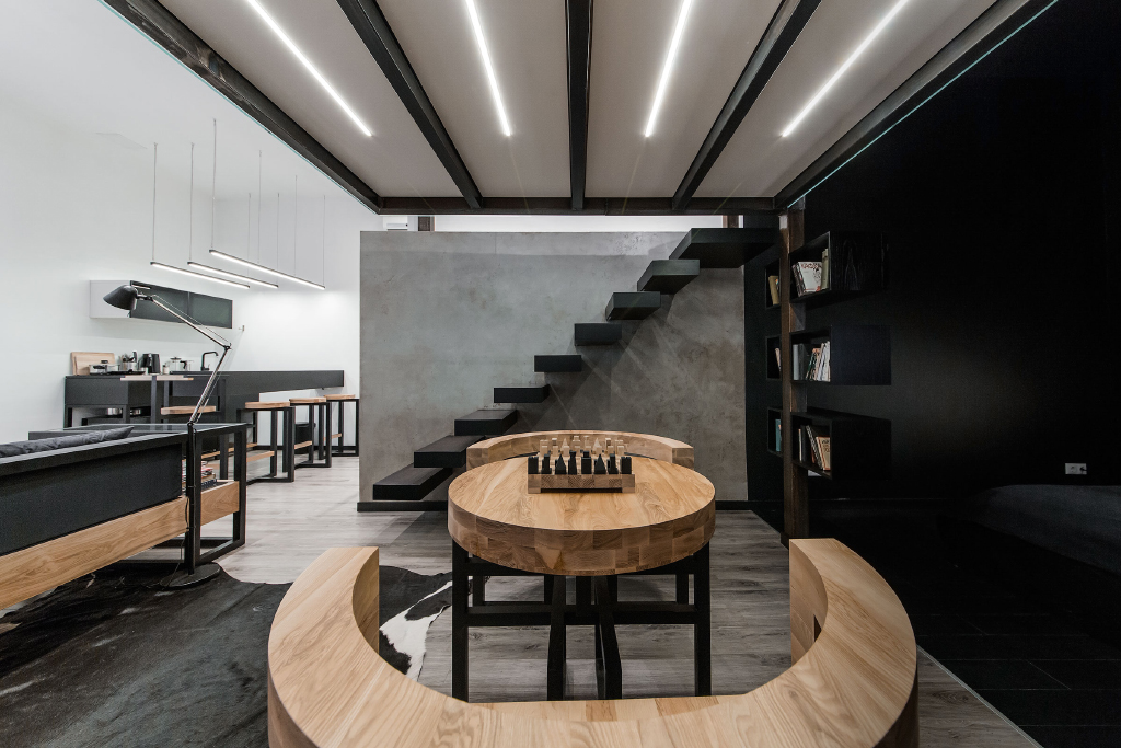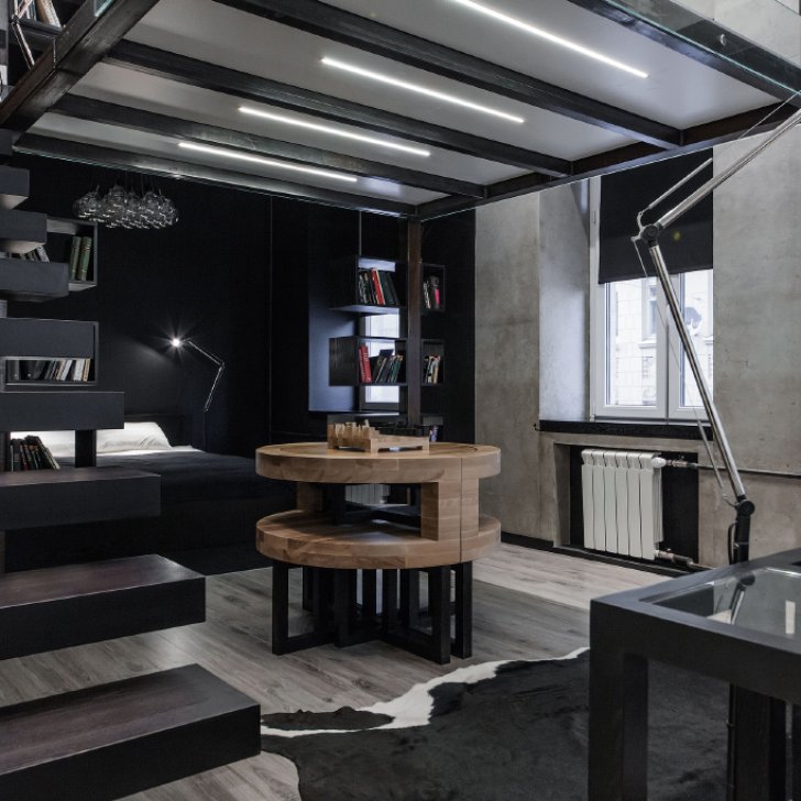 Интерьер в этой студии выполнен в стиле "Баухауз". Он отличается чёткими формами и линиями, а также удобством и функциональностью.