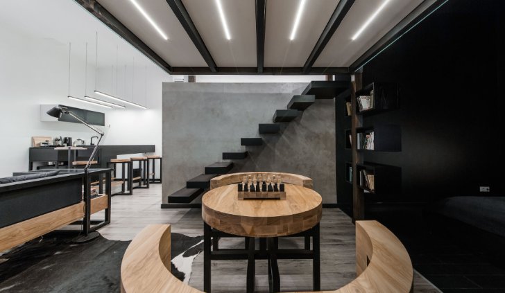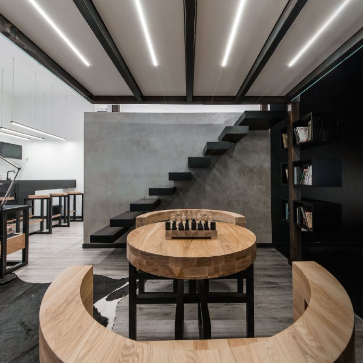 В рабочей зоне светодиодные профили установлены непосредственно на потолке. В этой зоне он низок, т.к. над ним расположен второй уровень студии. Поэтому такая компактность пришлась очень кстати, светильники совершенно не отнимают свободного пространства.