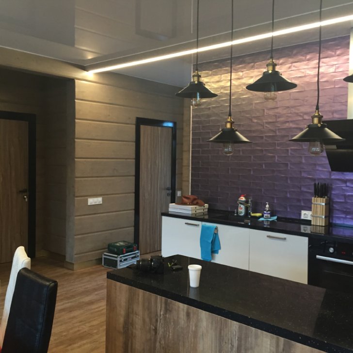 Линии света встроены в потолочные балки, что придало им еще больше эффектности. Для линий света был использован алюминиевый профиль Klus, в котором установлена мощная светодиодная лента Arlight со светодиодами smd 2835.