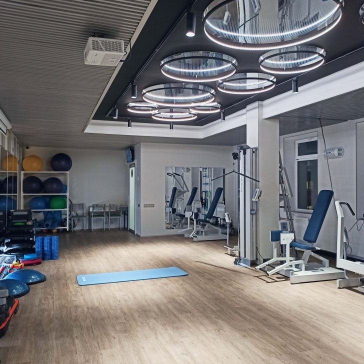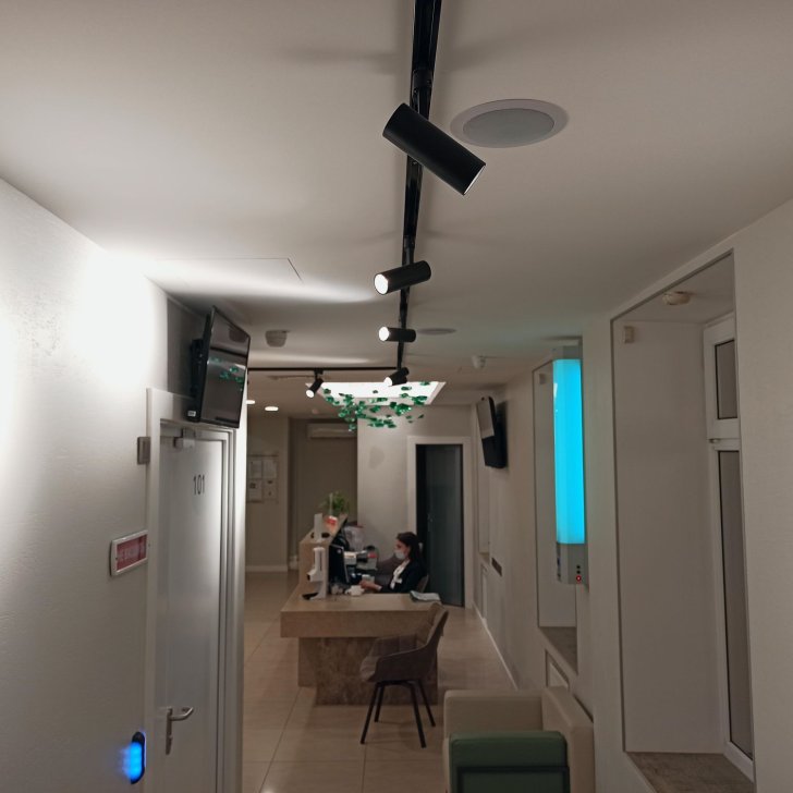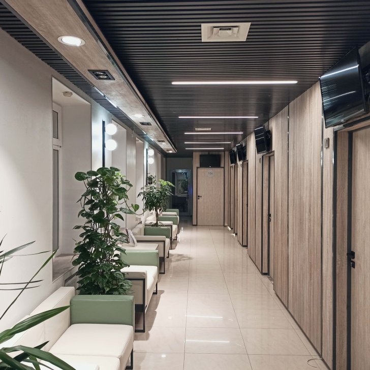 Дизайн медицинской клиники отличается классическими мотивами с доминированием спокойных натуральных оттенков и трех основных материалов: дерева, стекла и металла. Для обеспечения освещения больших пространств в клинике было применено разнообразие источников света. Встроенные круглые светильники и панели с высоким индексом цветопередачи обеспечивают качественное основное освещение без мерцания. Светодиодные панели «Армстронг» для потолков имеют высокую световую эффективность и гармонично вписываются в потолочное пространство.