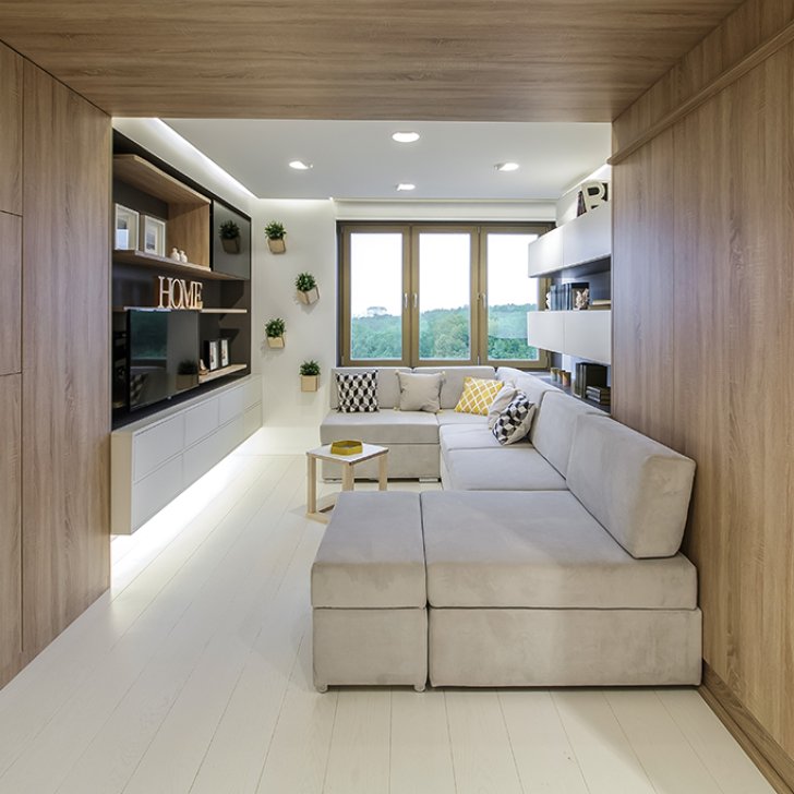 Основной задачей проекта стала организация многофункционального пространства в гостиной обычной квартиры. При переделке квартиры в рамках телепроекта "Квартирный вопрос" была применена светодиодная лента Arlight.
