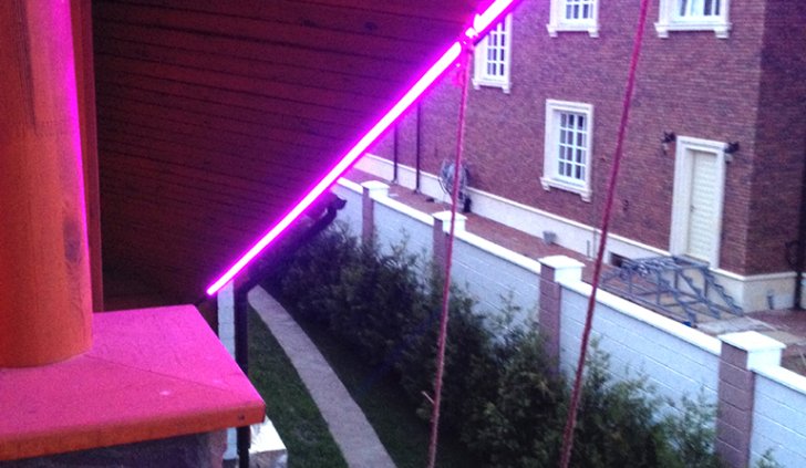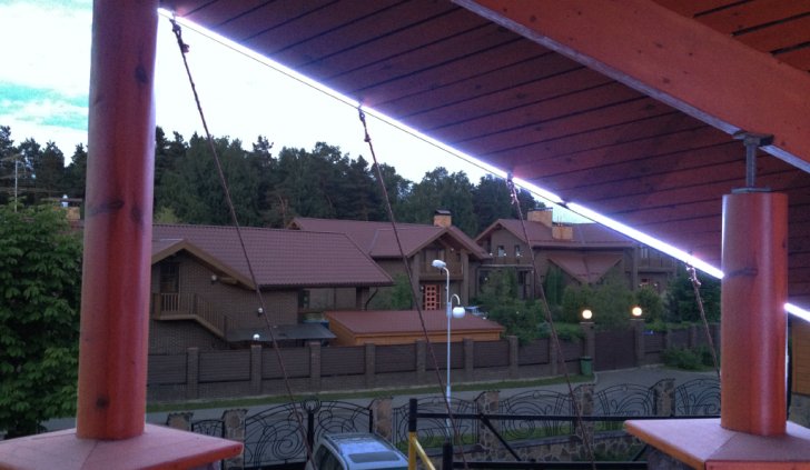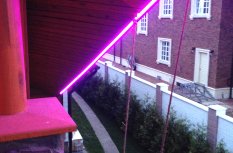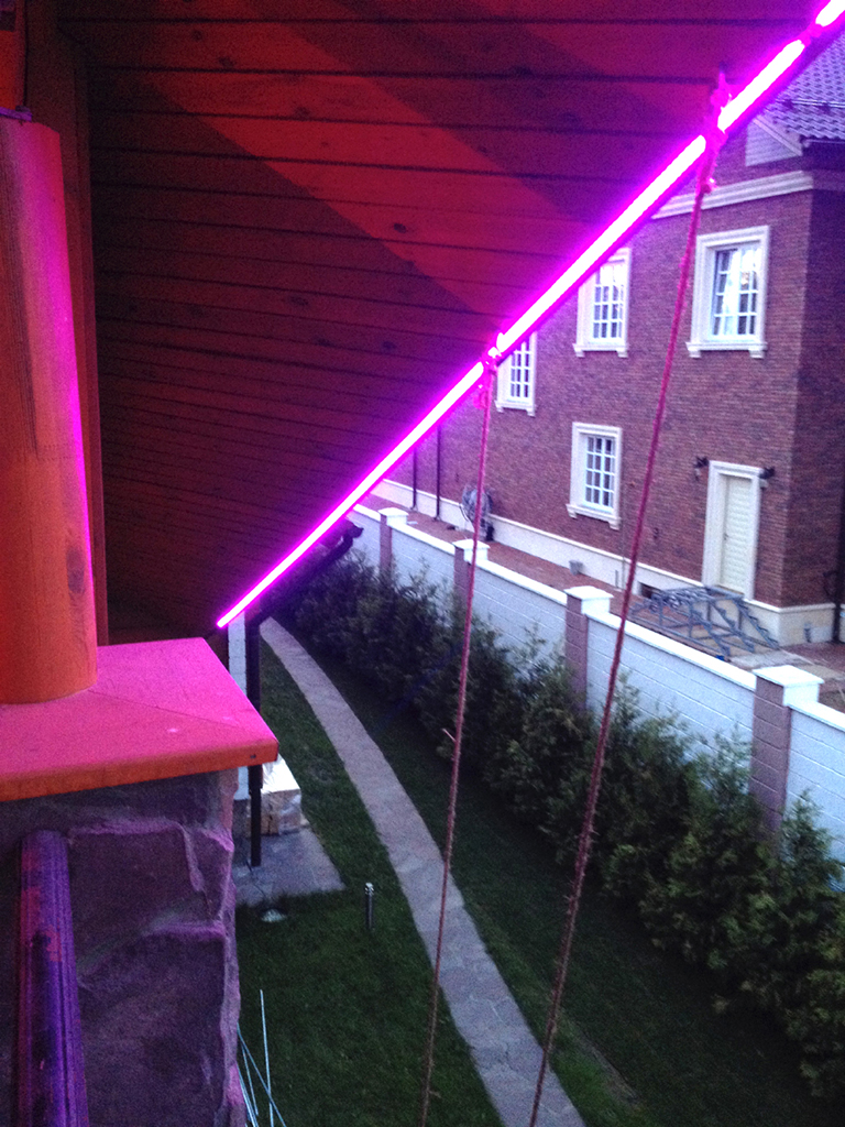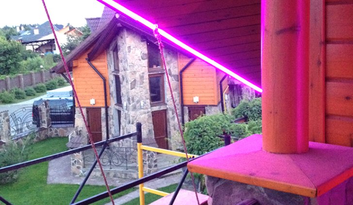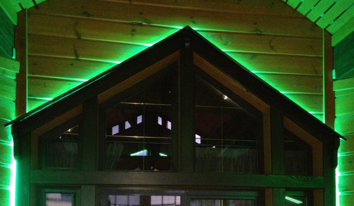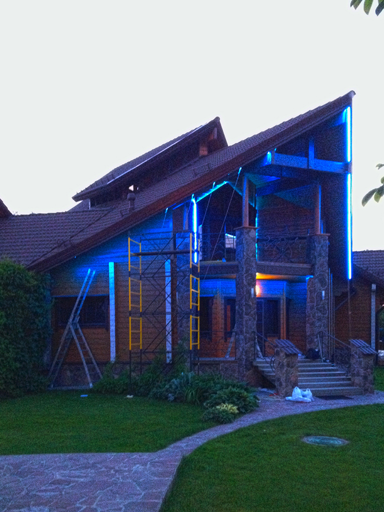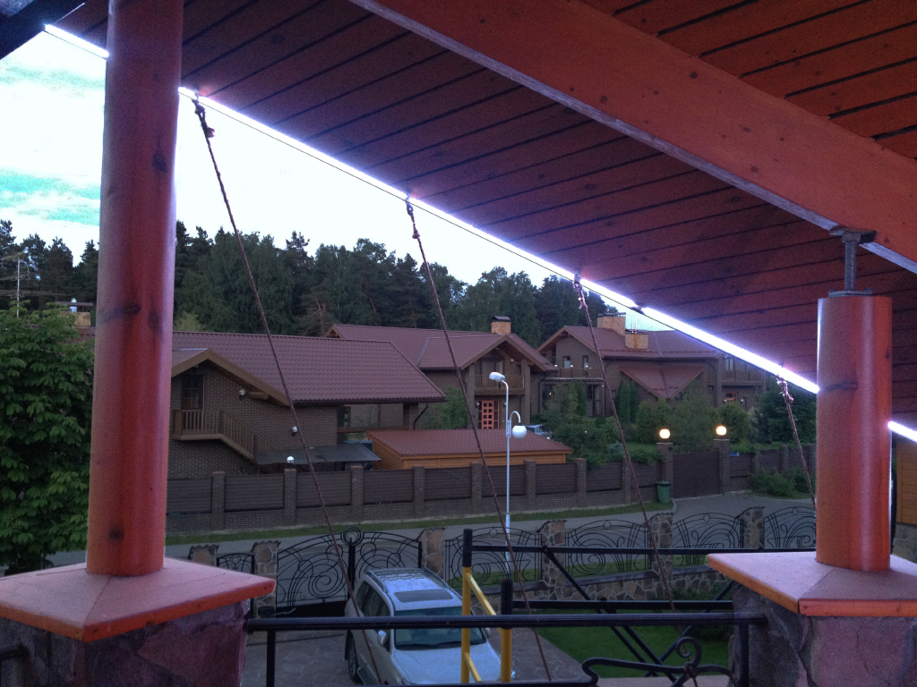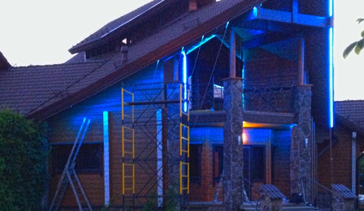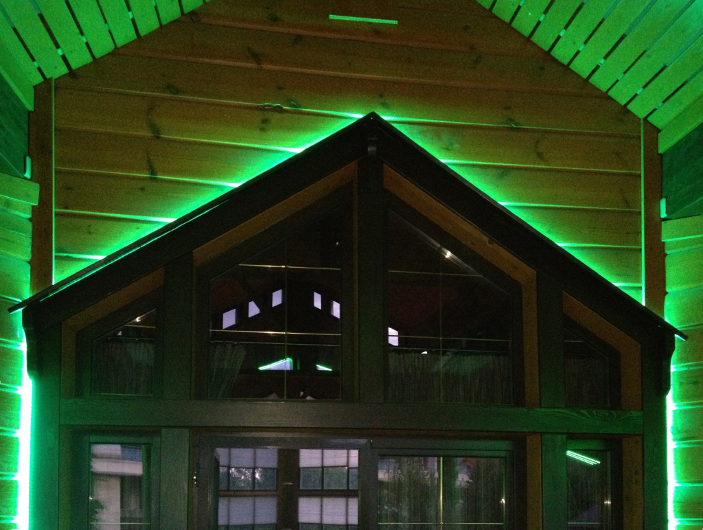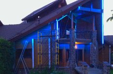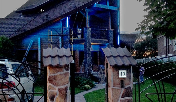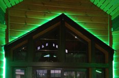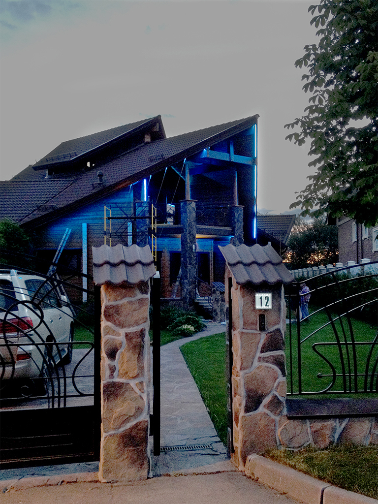 Для фасадной подсветки коттеджа была использована герметичная светодиодная лента RGB, имеющая степень защиты IP67. Высокая пылевлагощита особенно важна при организации фасадной подсветки, т.к. она позволяет защитить оборудование от воздействия непогоды.