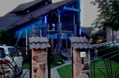 Многоцветная подсветка фасада стала украшением загородного дома, придав ему яркий и праздничный вид, независимо от времени года и погодных условий.