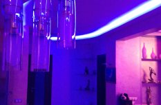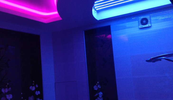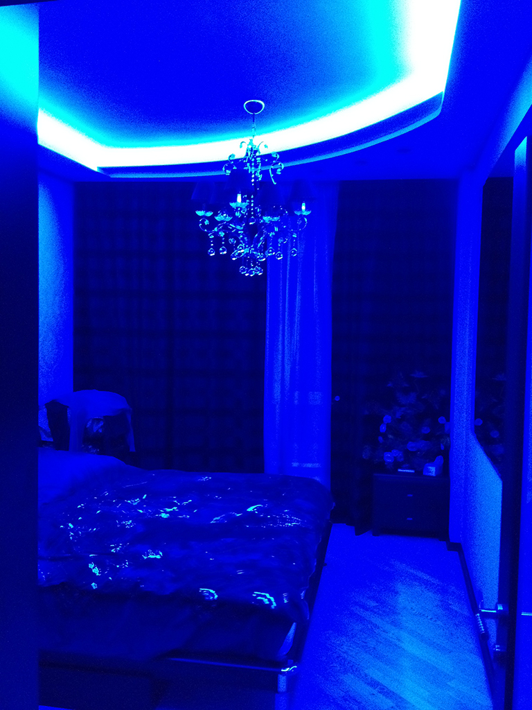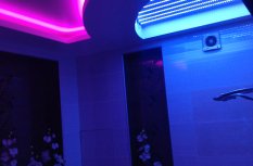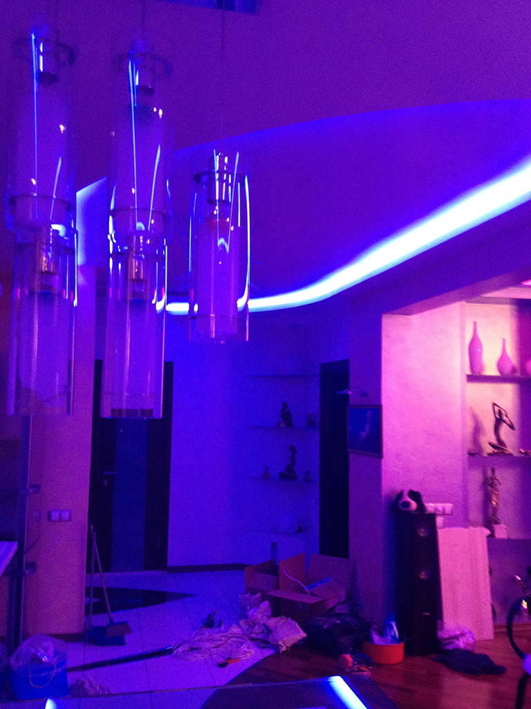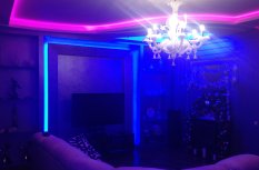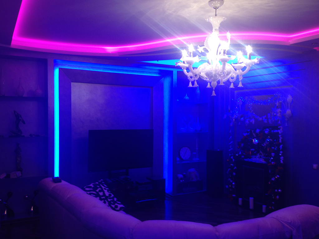 Владельцы квартиры предпочли управлять цветом и яркостью подсветки разных комнат с раздельных пультов. В гостиной и ванной комнате подсветка разбита на несколько зон, которые управляются независимо друг от друга с многозонного пульта ДУ.