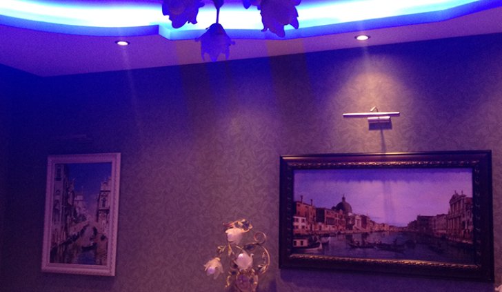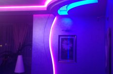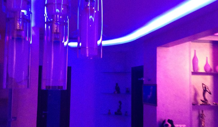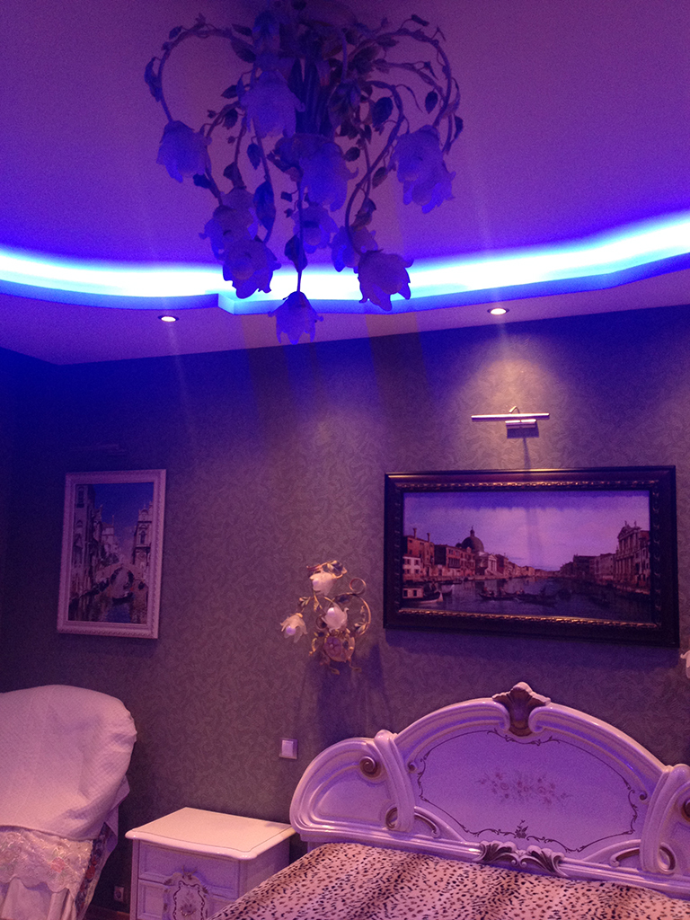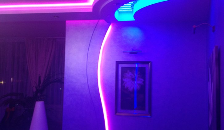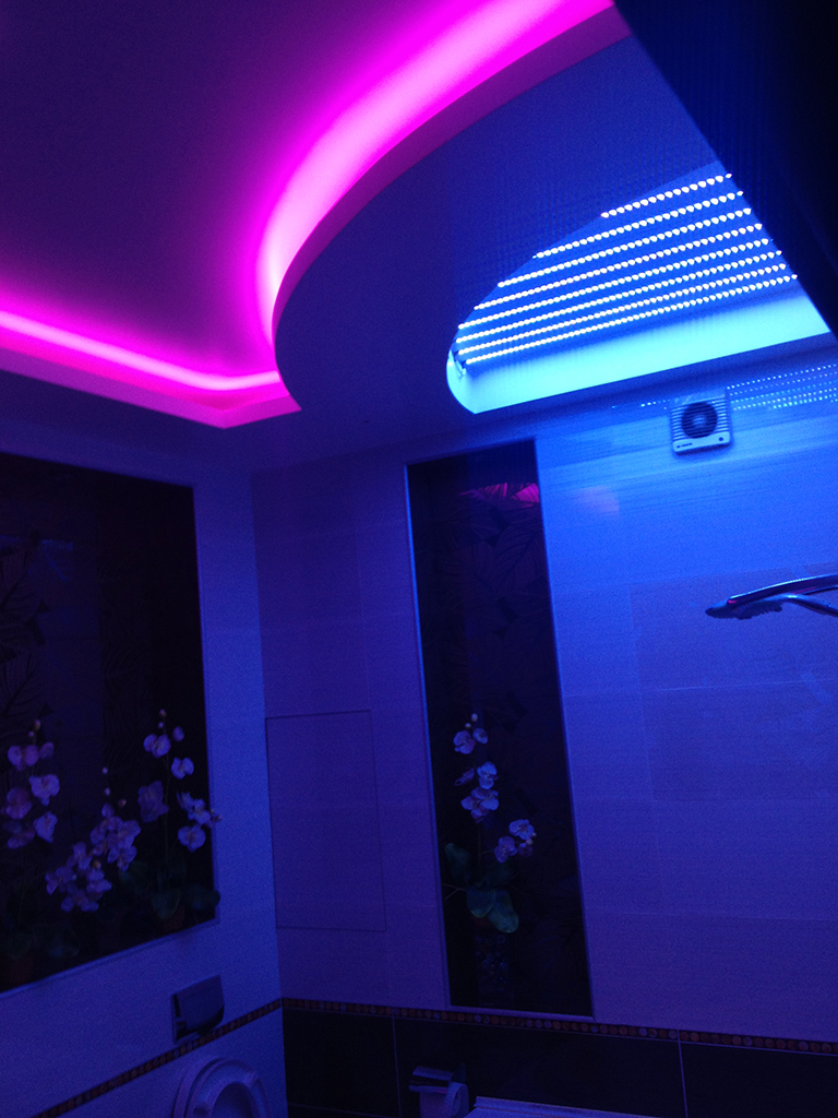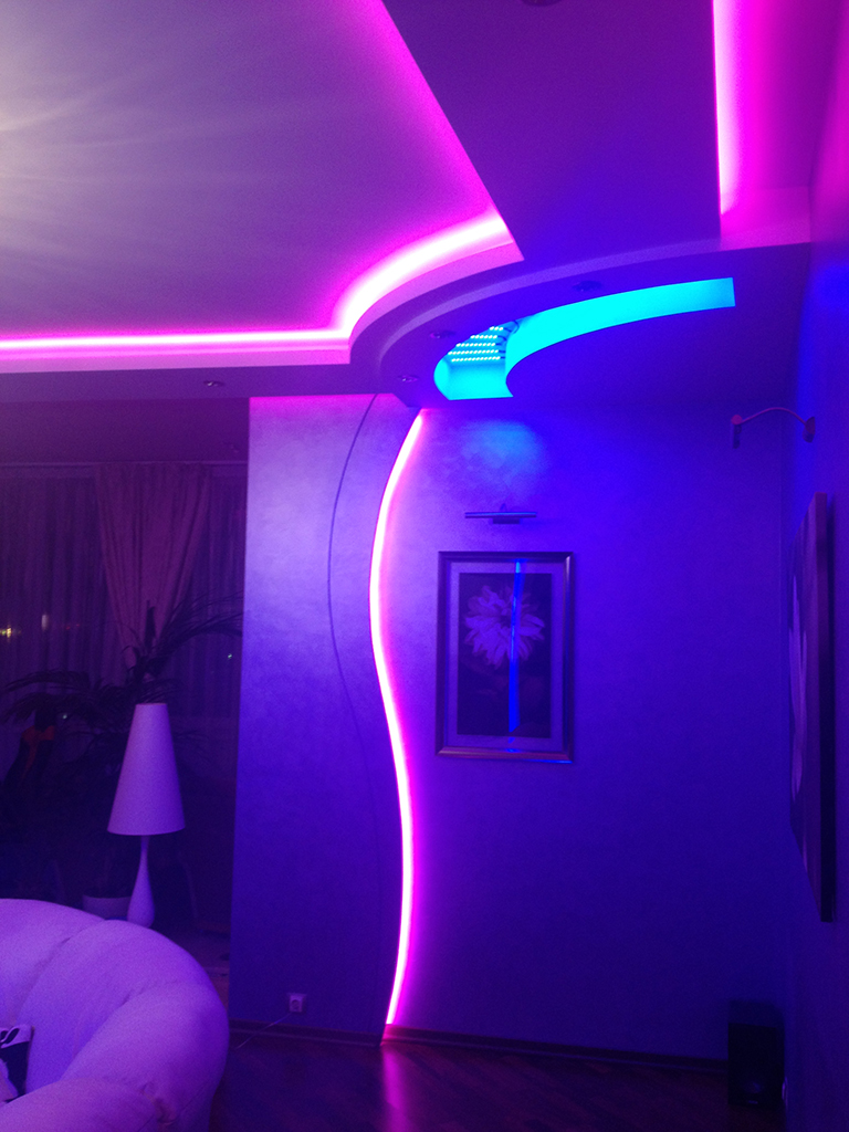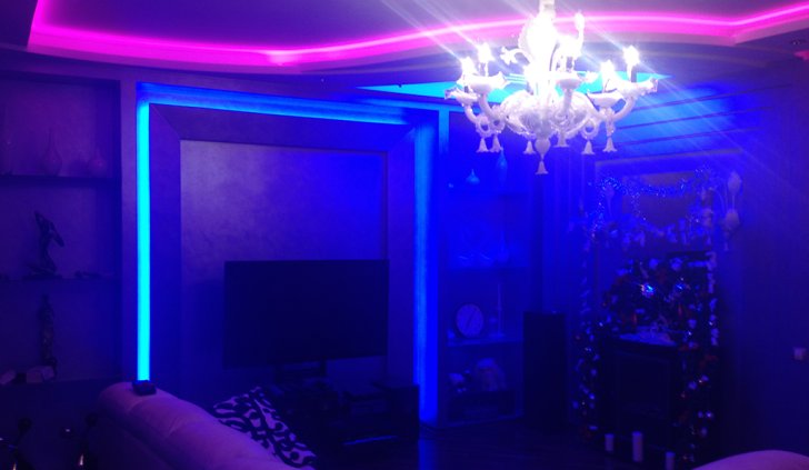 RGB контроллеры для управления многоцветными светодиодными лентами, а также источники питания для них скрыты в внутреннем пространстве ниш многоуровневых потолков.