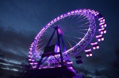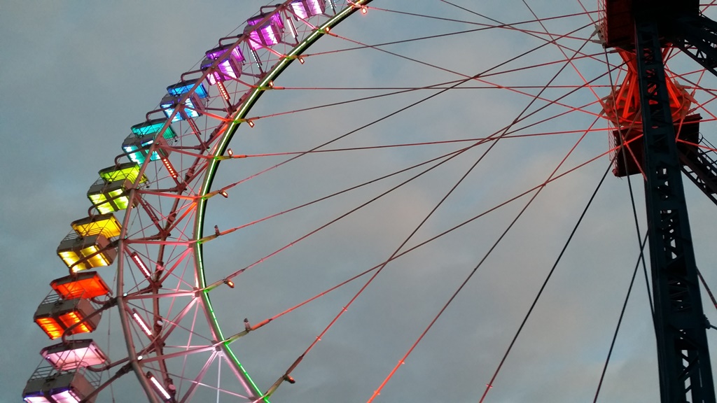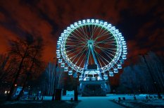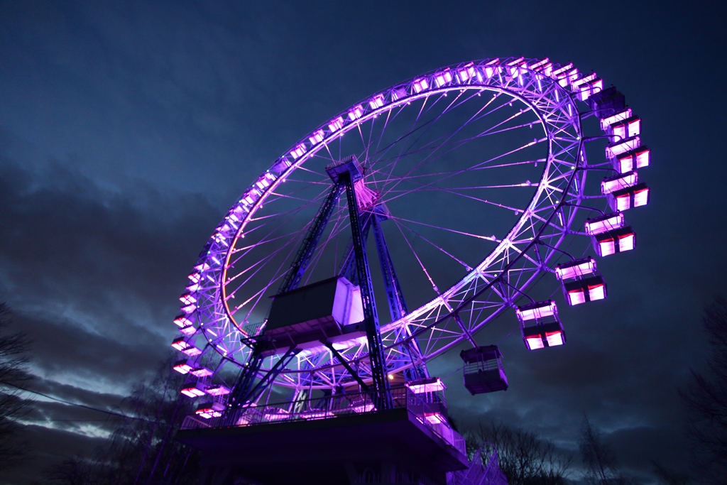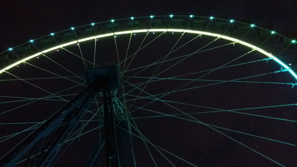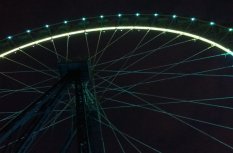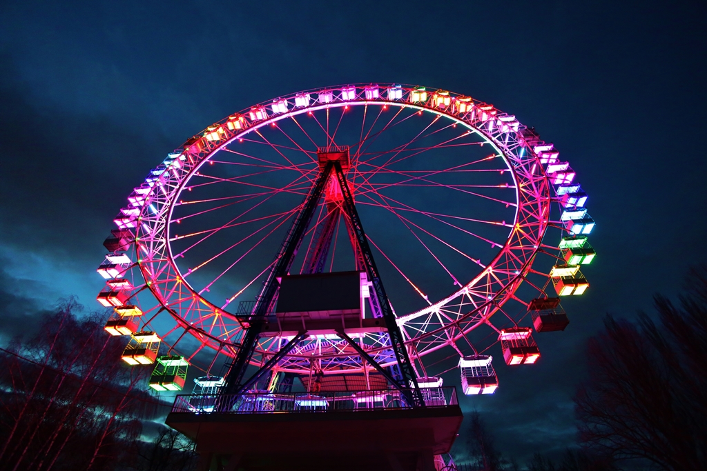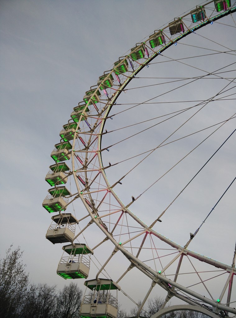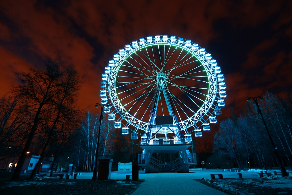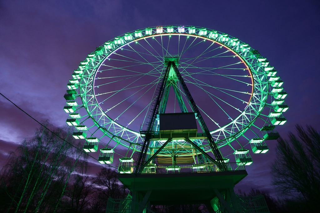 Многоцветная светодиодная подсветка колеса обозрения со светодинамическими эффектами состоит из 5 независимо управляемых контуров. Так, подсветка кабинок выполнена заливными светодиодными RGB прожекторами. А на внешнюю несущую круговую раму установлены заливные светодиодные RGB прожекторы, светодиодные RGB флеш-модули, осветительные светодиодные прожекторы. Для реализации проекта применялось оборудование торговой марки Arlight.