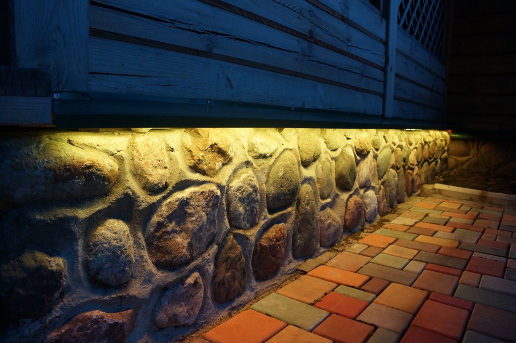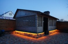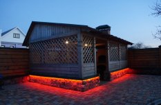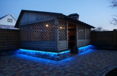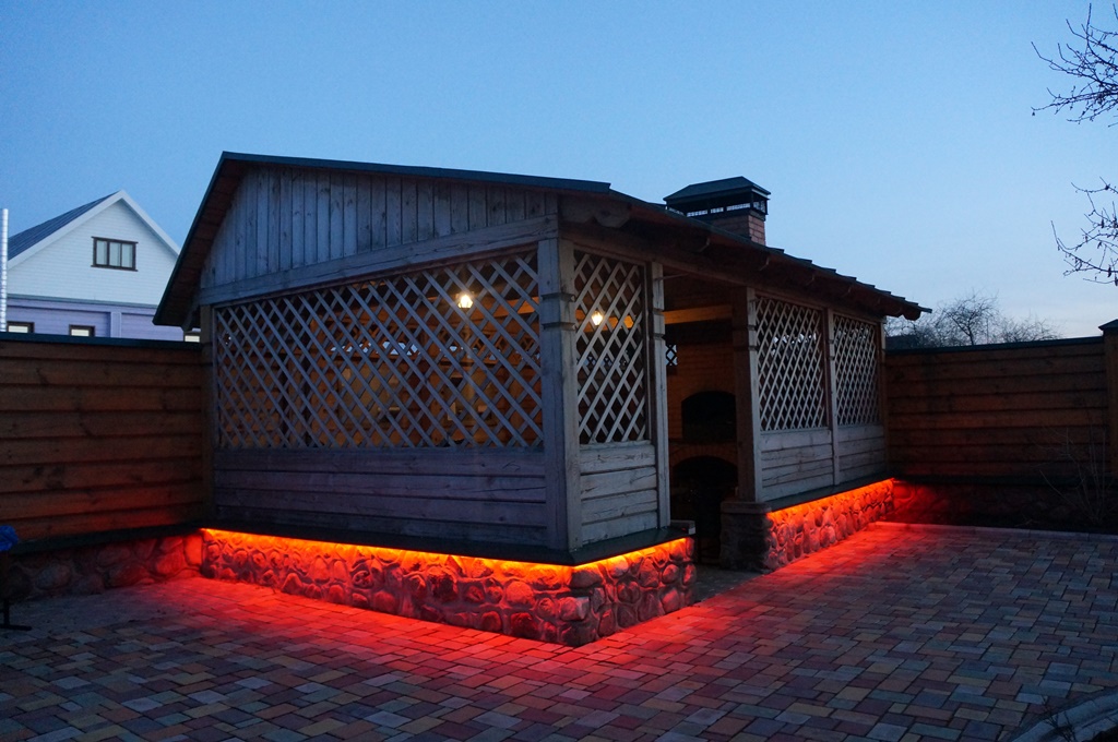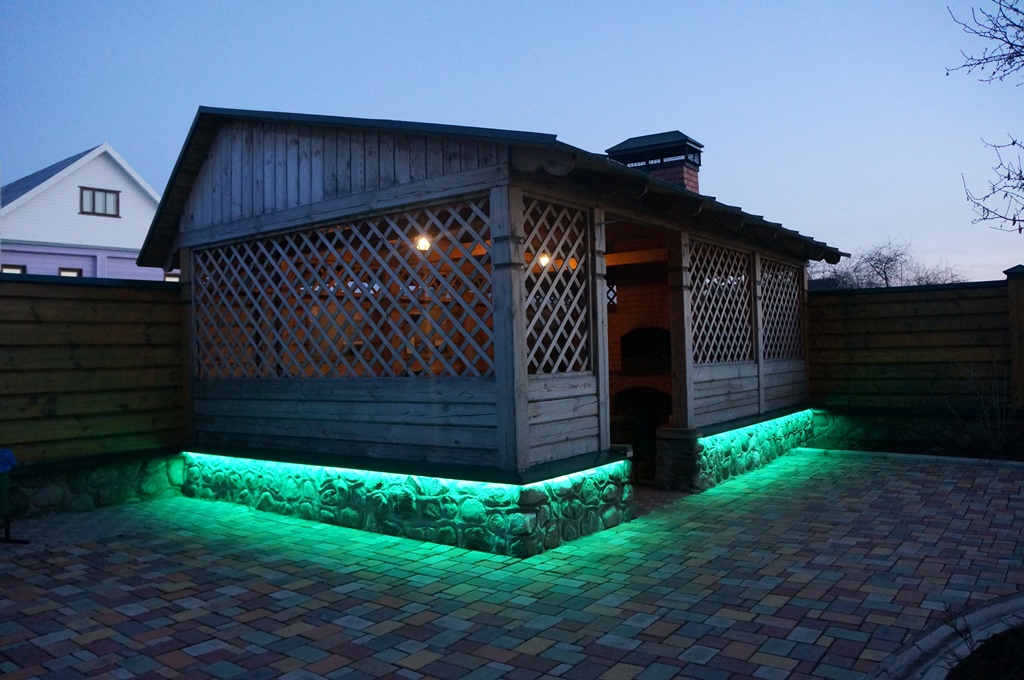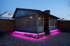 Красочная многоцветная подсветка фасада, выполненная при помощи светодиодной ленты RGB, произведенной компанией Arlight, значительно улучшила внешний вид беседки в гостевом доме.