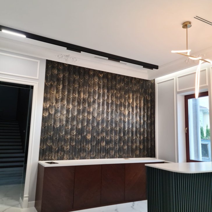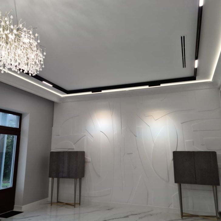 В прихожей были решены важные задачи. Низкий потолок и отсутствие возможности спрятать провода за потолочным полотном привели к нестандартным решениям. Во-первых, были использованы профильные светильники на подвесах. Во-вторых, проведен питающий кабель внутри корпуса линейного светильника длиной 12 метров. Для этого был выбран H-образный профиль, который вместил все коммуникации.
