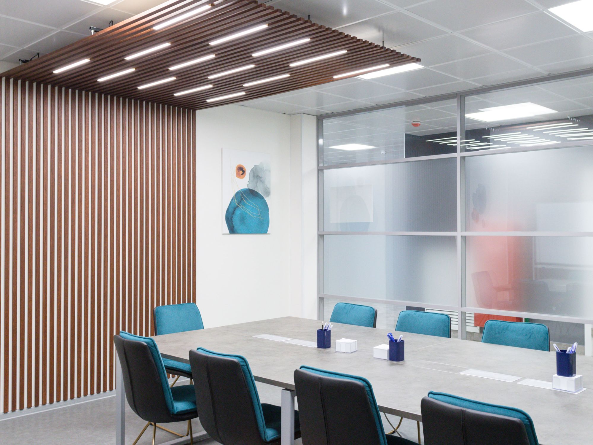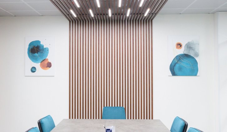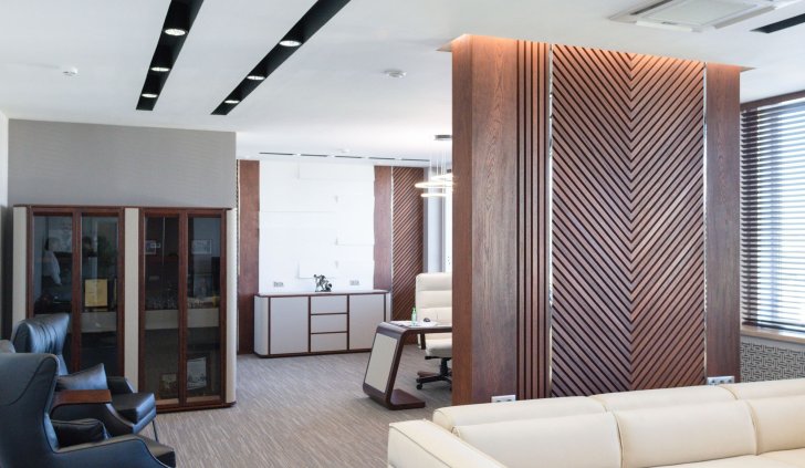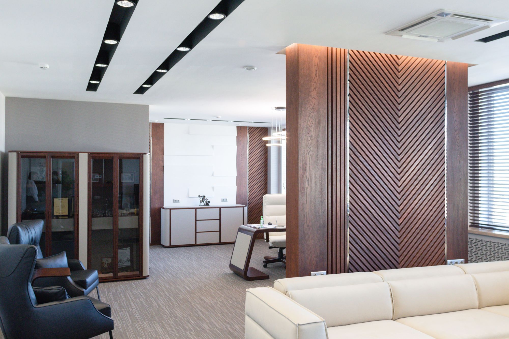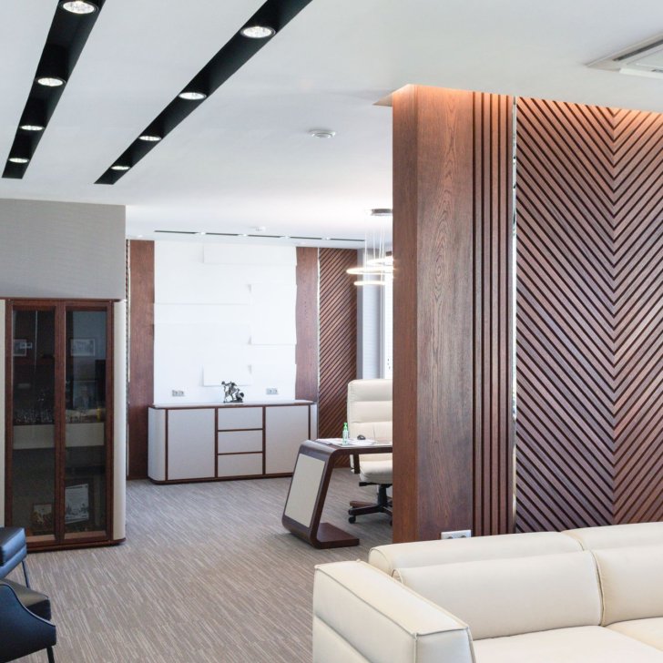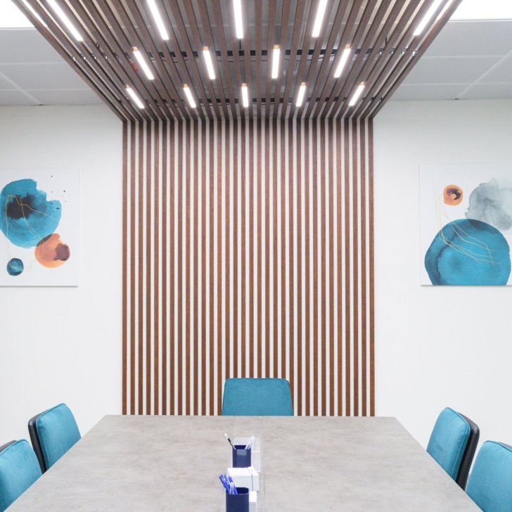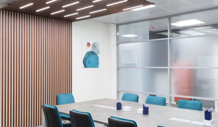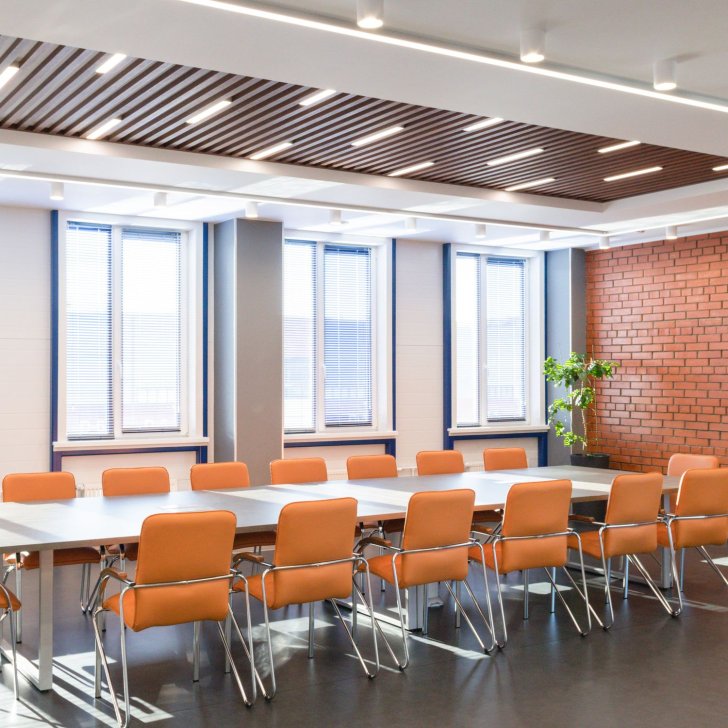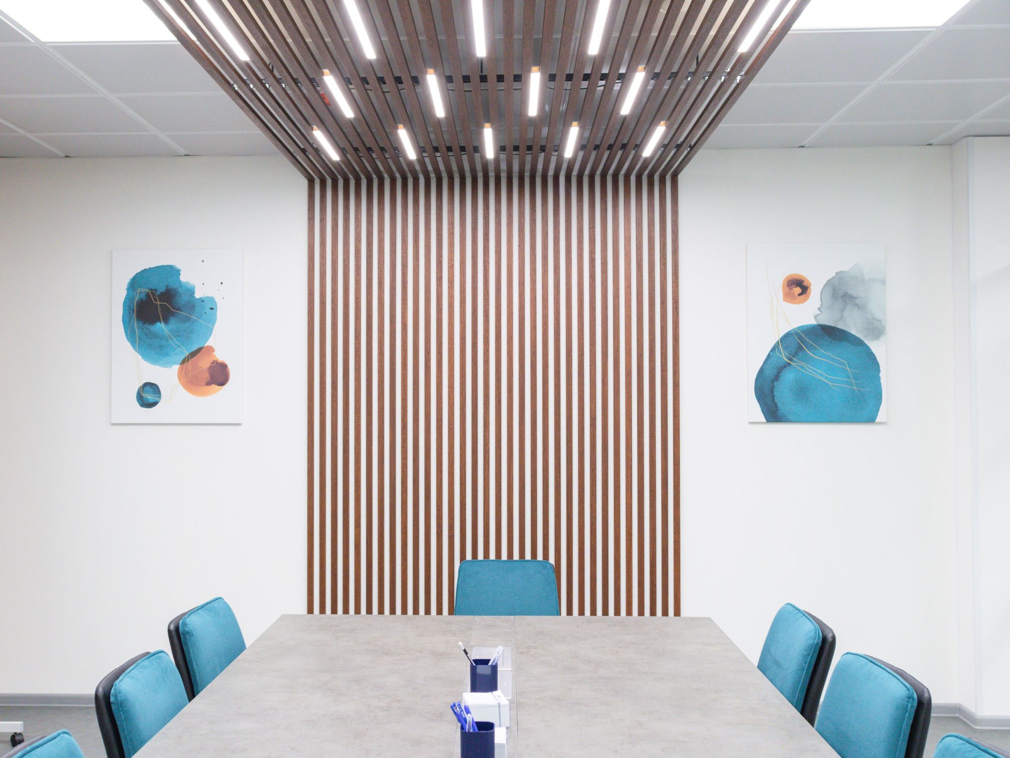 Линейные светильники в потолочных перекрытиях создают ритмичный рисунок и подчеркивают теплоту натурального дерева, а золотистый оттенок дополняет образ богатством и изысканностью. Линии света охватывают весь периметр потолка, образуя прямоугольное светодиодное полотно с четким контуром. Широкая двурядная лента с дневным белым свечением обладает высокой световой эффективностью и позволяет создавать встроенные или подвесные линии света для основного освещения. В зоне переговорной установлены удобные выключатели для управления светом и возможности включения или выключения источников света как по отдельности, так и вместе. Это обеспечивает комфорт и функциональность использования освещения в соответствии с различными потребностями.