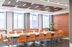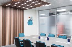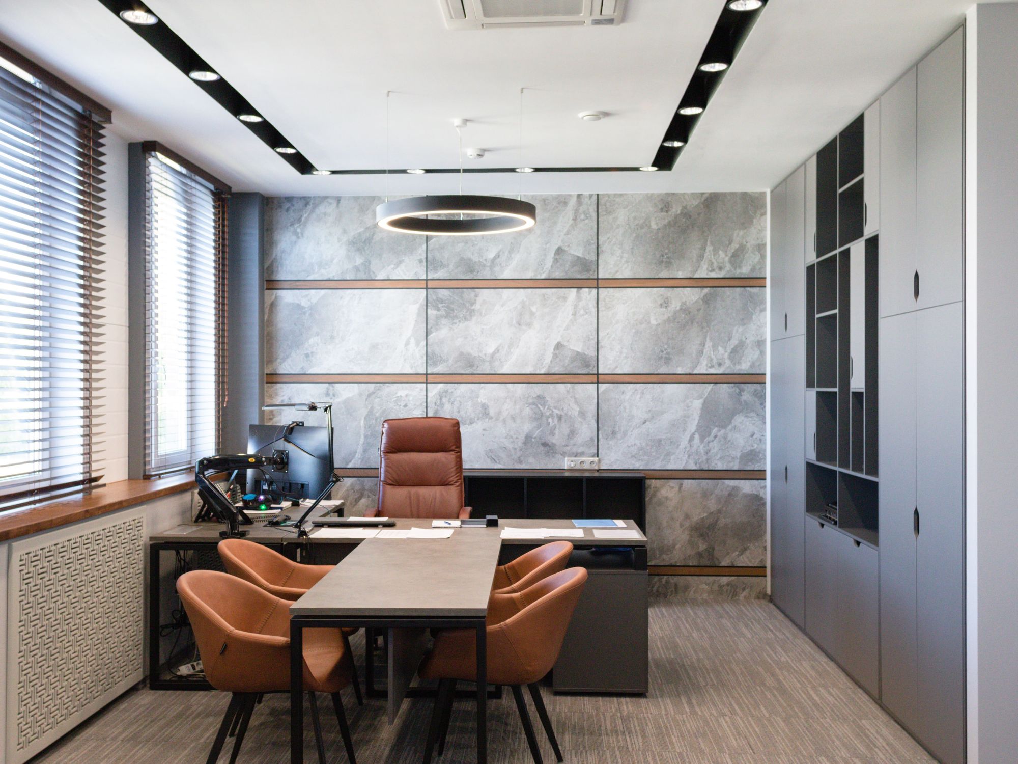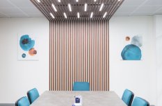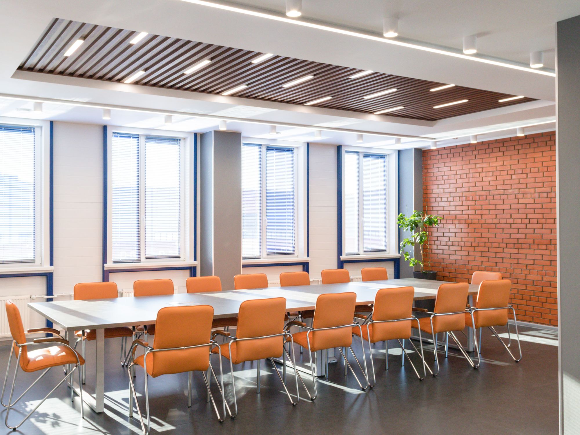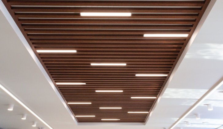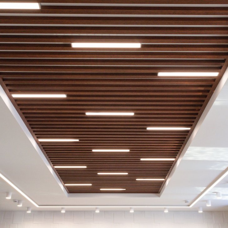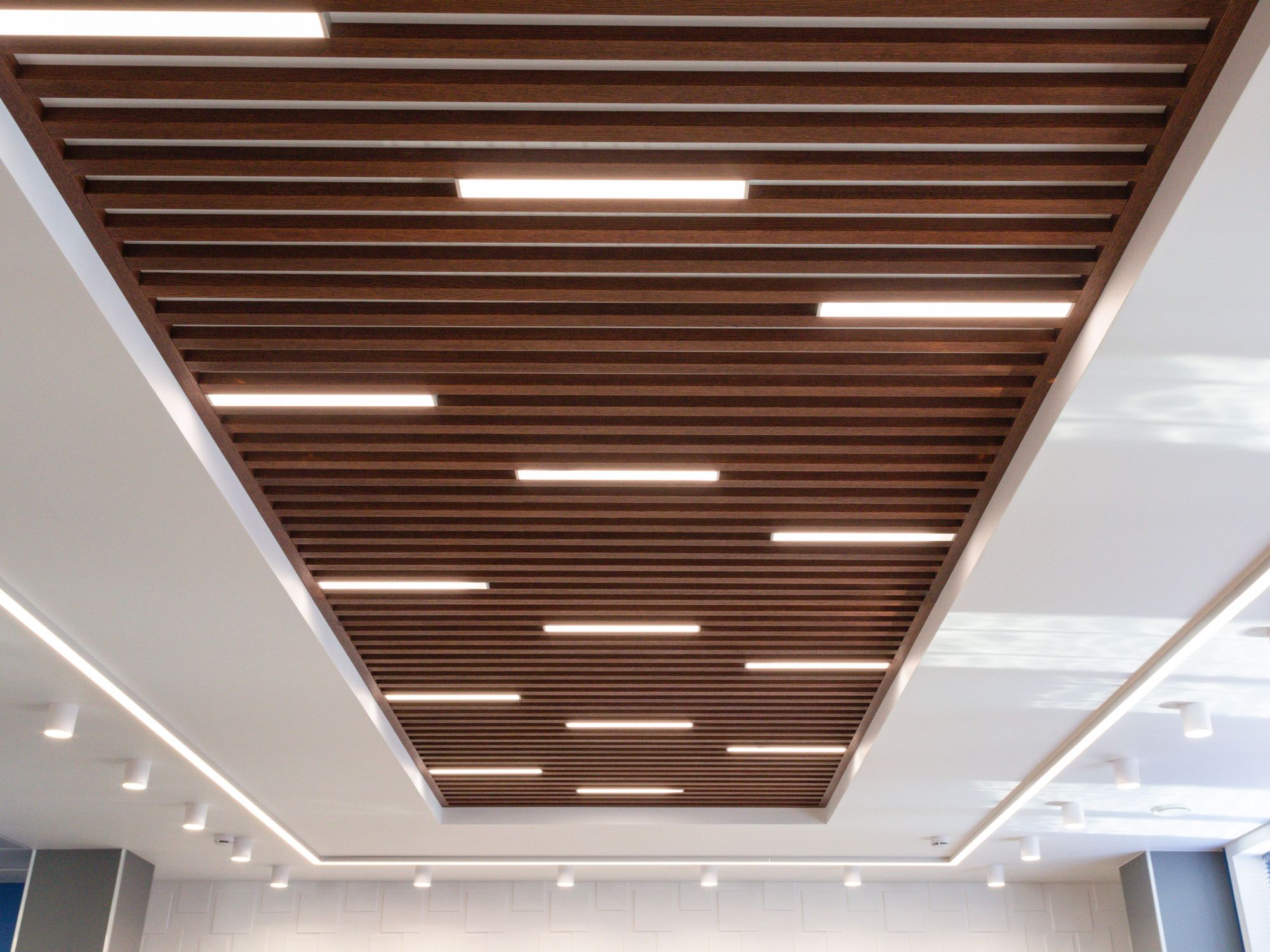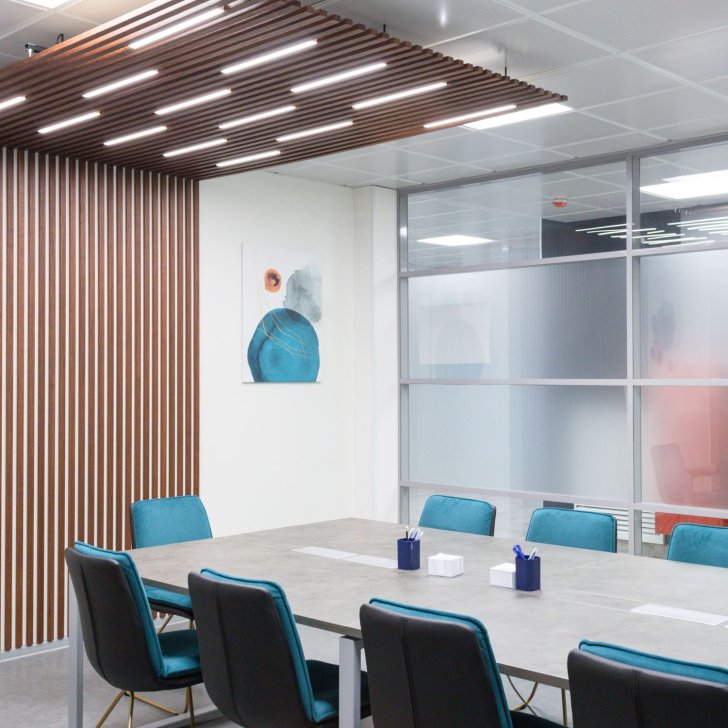 Линейные светильники в потолочных перекрытиях создают ритмичный рисунок и подчеркивают теплоту натурального дерева, а золотистый оттенок дополняет образ богатством и изысканностью. Линии света охватывают весь периметр потолка, образуя прямоугольное светодиодное полотно с четким контуром. Широкая двурядная лента с дневным белым свечением обладает высокой световой эффективностью и позволяет создавать встроенные или подвесные линии света для основного освещения. В зоне переговорной установлены удобные выключатели для управления светом и возможности включения или выключения источников света как по отдельности, так и вместе. Это обеспечивает комфорт и функциональность использования освещения в соответствии с различными потребностями.