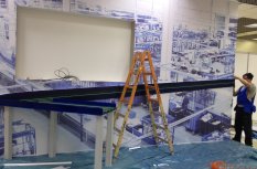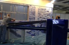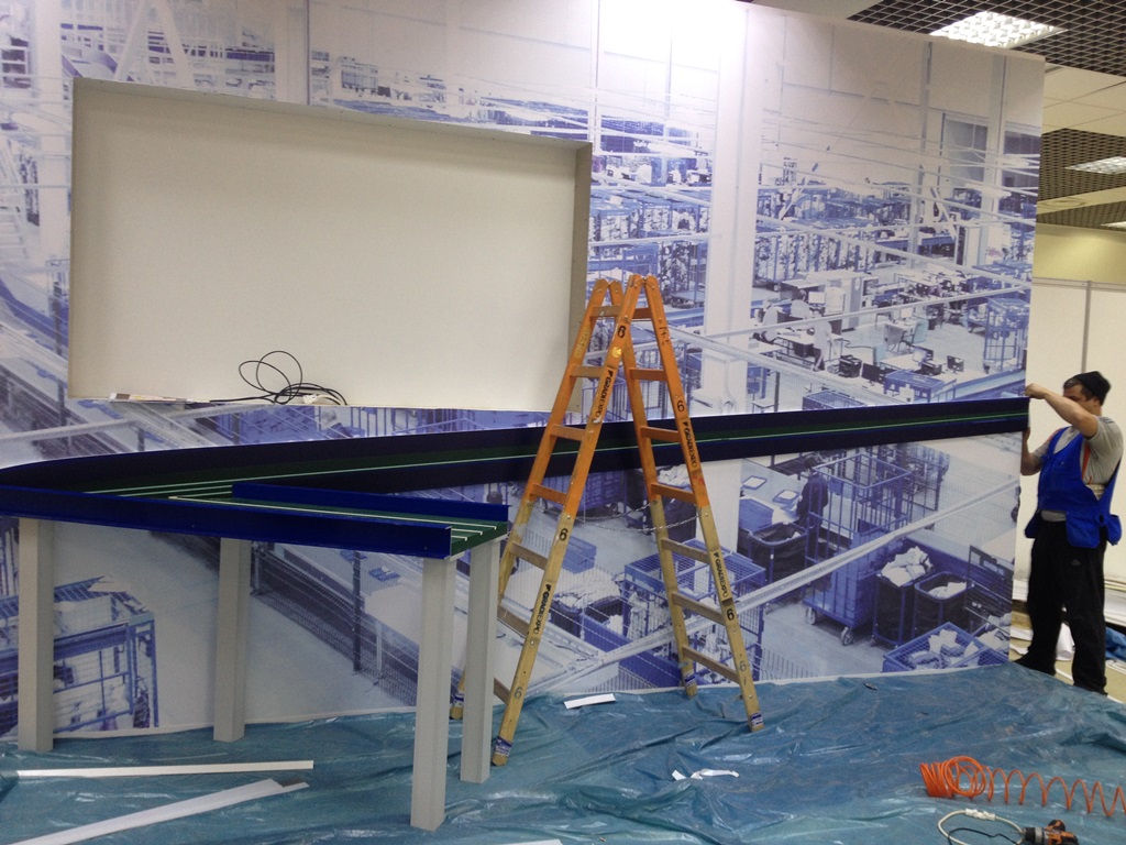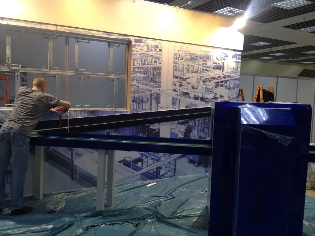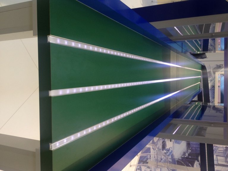 Во время выполнения работ использовалась продукция под маркой Arlight. Если говорить конкретнее, то помимо светодиодной ленты использовался контроллер, создающий эффект «бегущего огня». Благодаря данному устройству удалось создать собственные программы управления освещением с последующей записью их на карту памяти. Кстати, для более эффектного выполнения задачи, LED лента Arlight устанавливалась в специальный алюминиевый профиль для светодиодной ленты, закрытый матовым экраном. Профиль монтировался на стену, а также непосредственно на сам стенд, для чего были сделаны штробы.