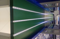 Для выполнения заказа на конвейерную ленту установили три светодиодные ленты параллельно. Именно они должны были создавать эффект движения. Стоит отметить, что, несмотря на длину модели 5,5 метров, предполагалось, что на стене будет изображен нарисованный конвейер, и он также должен быть в движении. С учетом всех этих требований, каждая из лент имела длину около 12 метров.