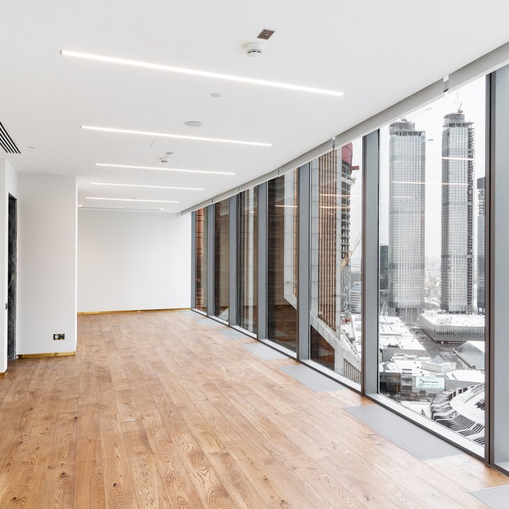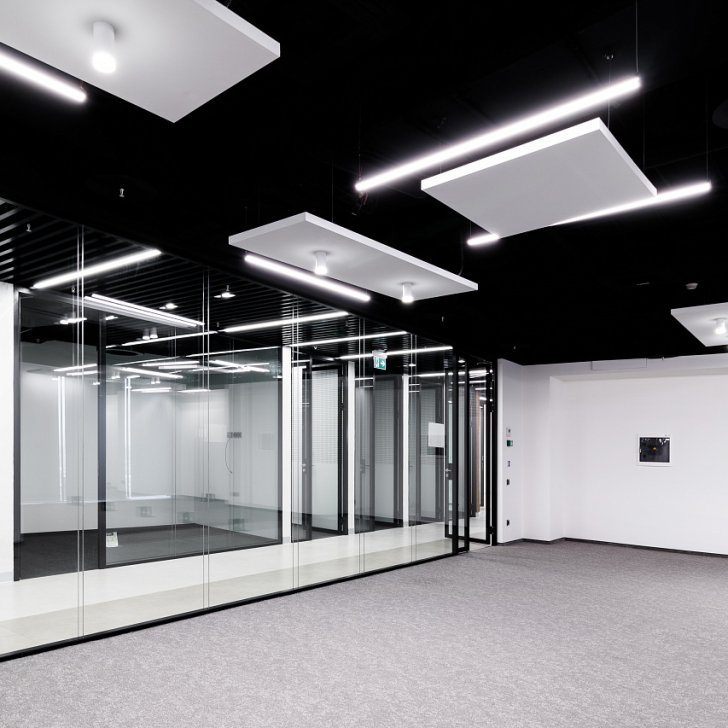 Оригинальное решение в некоторых зонах офиса – это чёрный потолок, на фоне которого особенно контрастно выделяются полосы света. Точечные светильники закреплены на белых подвесных панелях на том же уровне, что и светильники из профиля.