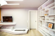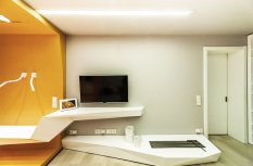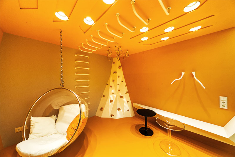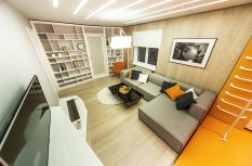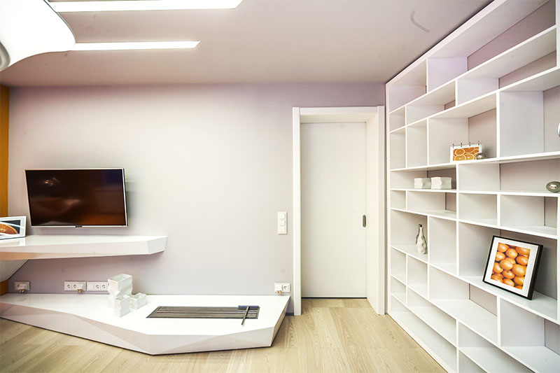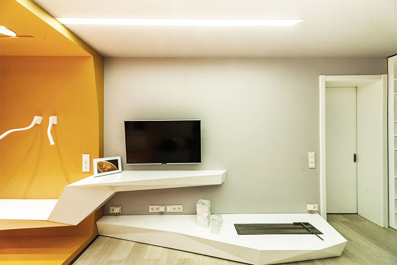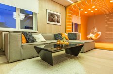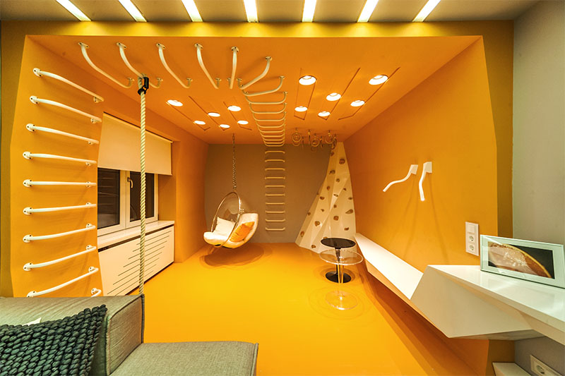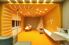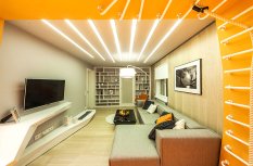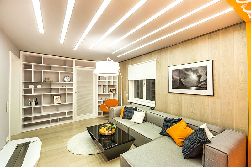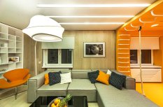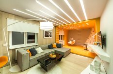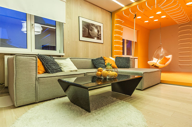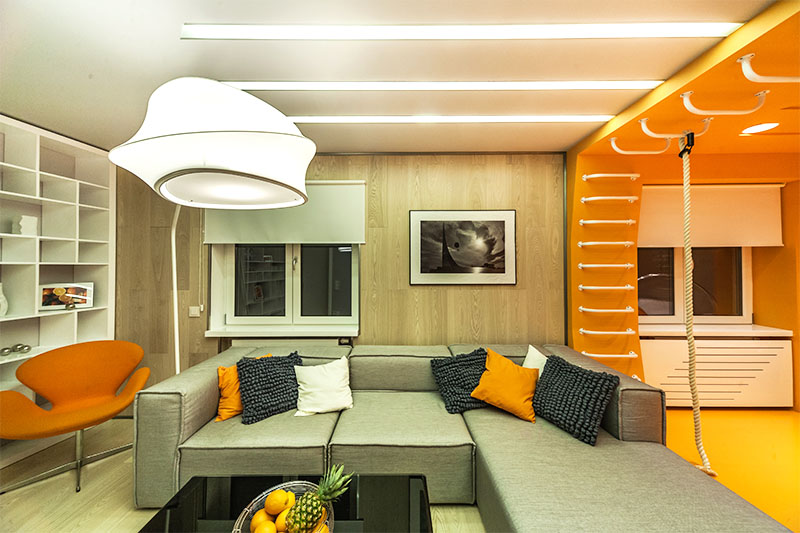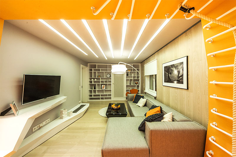 Визуально дизайнерам удалось объединить противоположные направления отдыха и спорта, сделав интерьер гостиной несколько футуристичным, в том числе, благодаря освещению. Здесь нет традиционной люстры, вместо неё основное освещение обеспечивается благодаря световым полосам, равномерно распределённым по потолку. Довольно широкие полосы сделаны на базе алюминиевого профиля и светодиодной ленты и закрыты матовым экраном.
